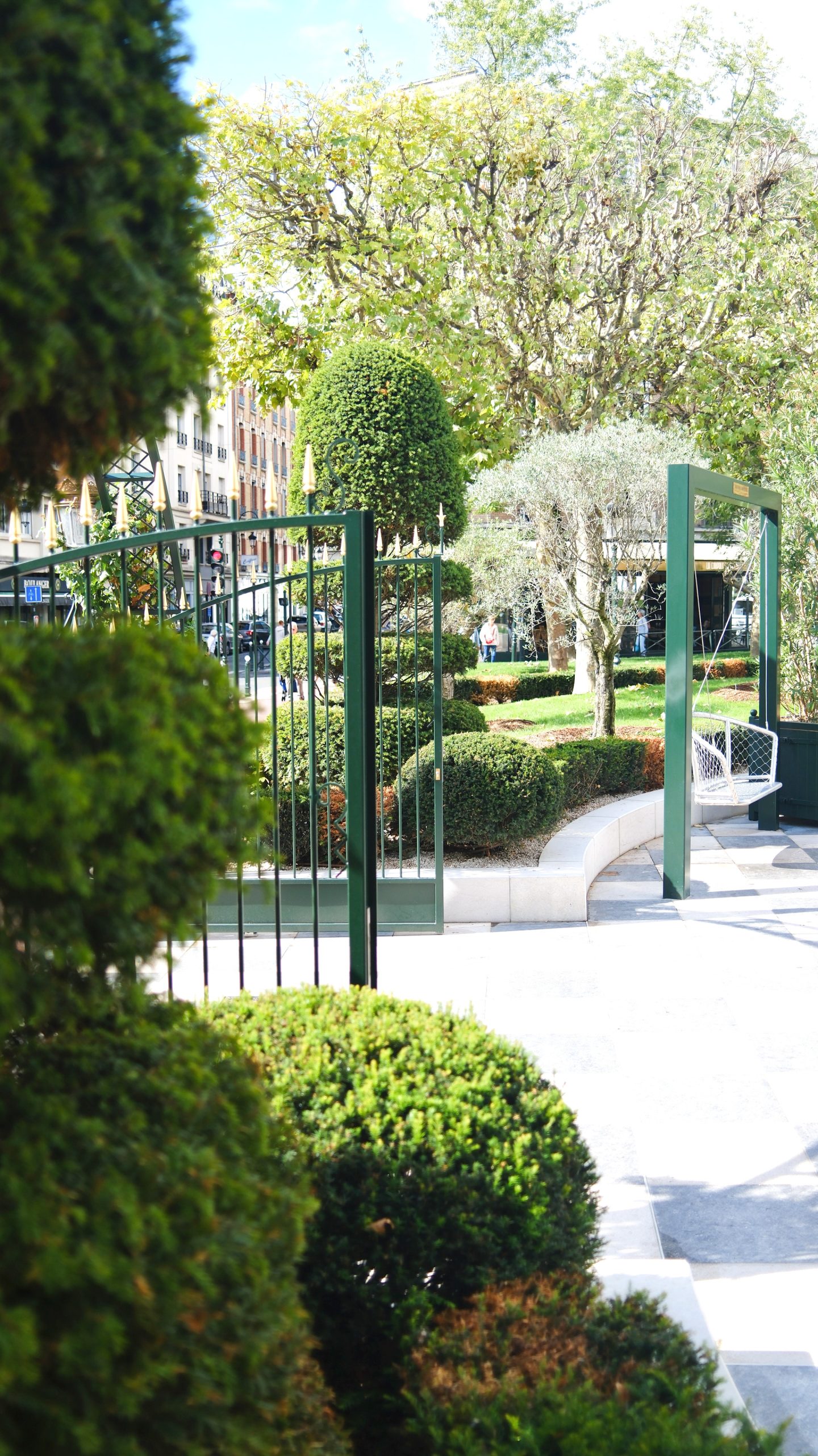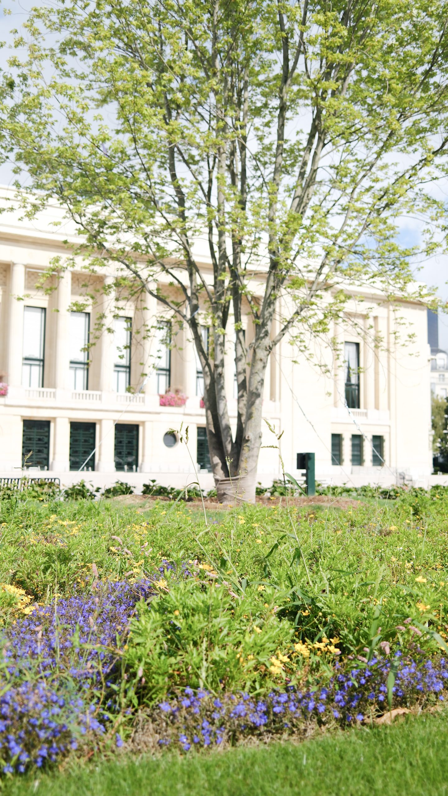 El proyecto se basa en una composición clara y equilibrada entre lo mineral y lo vegetal. Por un lado, el atrio mineral, estructurado mediante un pavimento a cuadros, guía de forma natural la mirada y los recorridos hacia los elementos verticales destacados del sitio: fachadas, árboles, pérgolas. Por otro lado, el atrio-jardín, plantado, aporta sombra y frescura.
