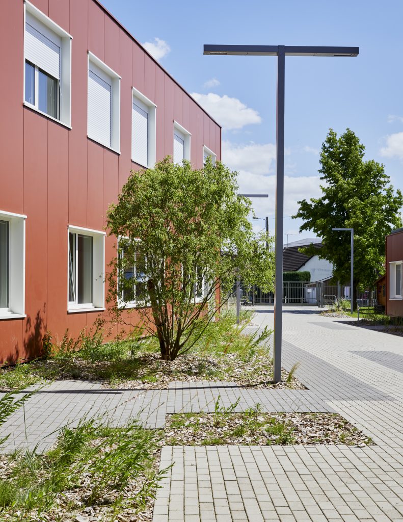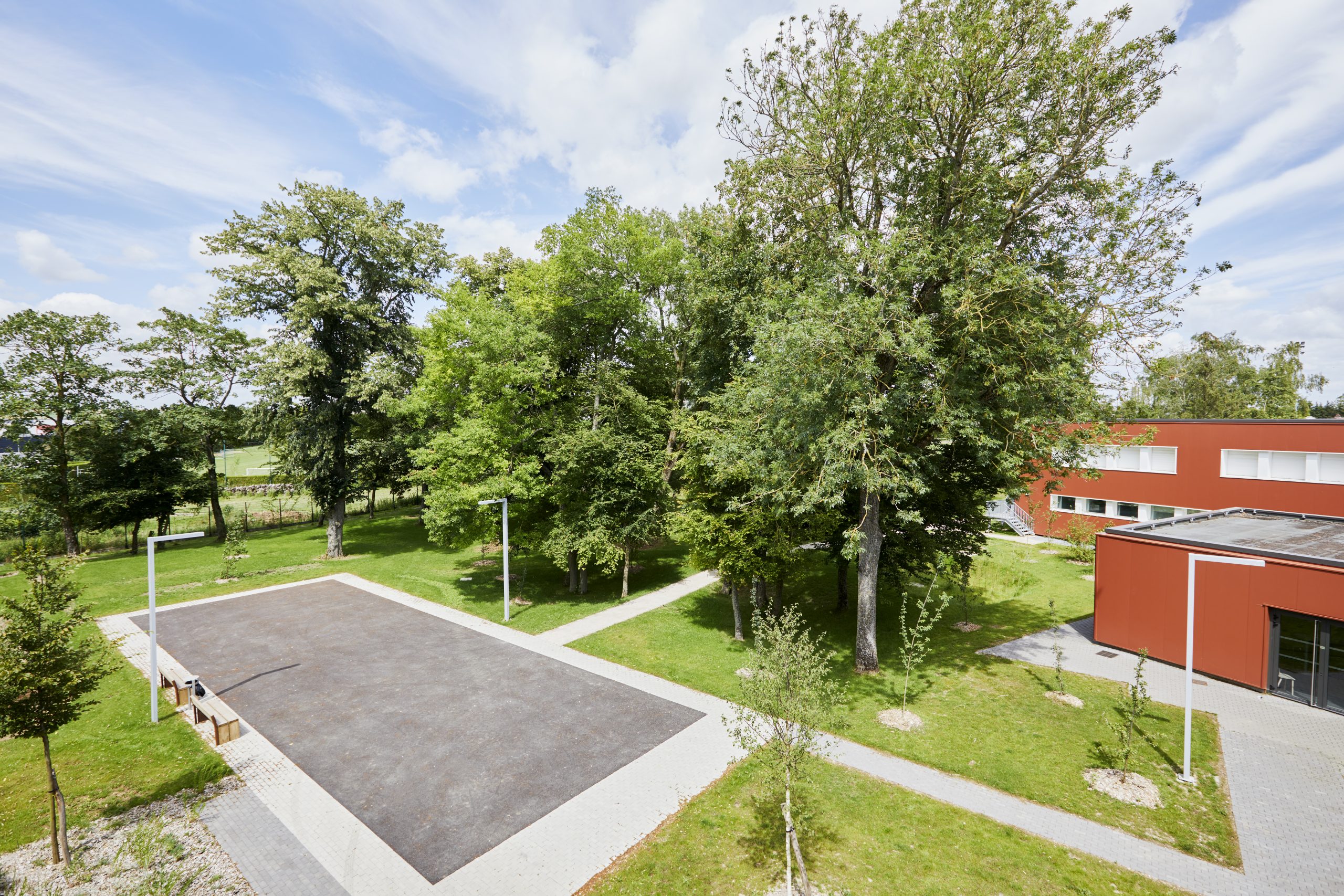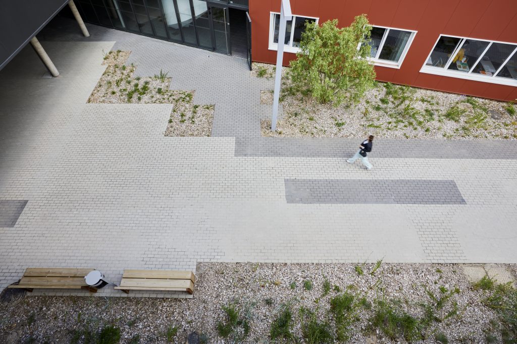 El nuevo patio se sitúa en el extremo del eje principal, en el punto donde convergen todos los caminos. Este espacio ofrece zonas de descanso y relajación para los alumnos, así como rincones más íntimos que permiten sentirse “protegido”.