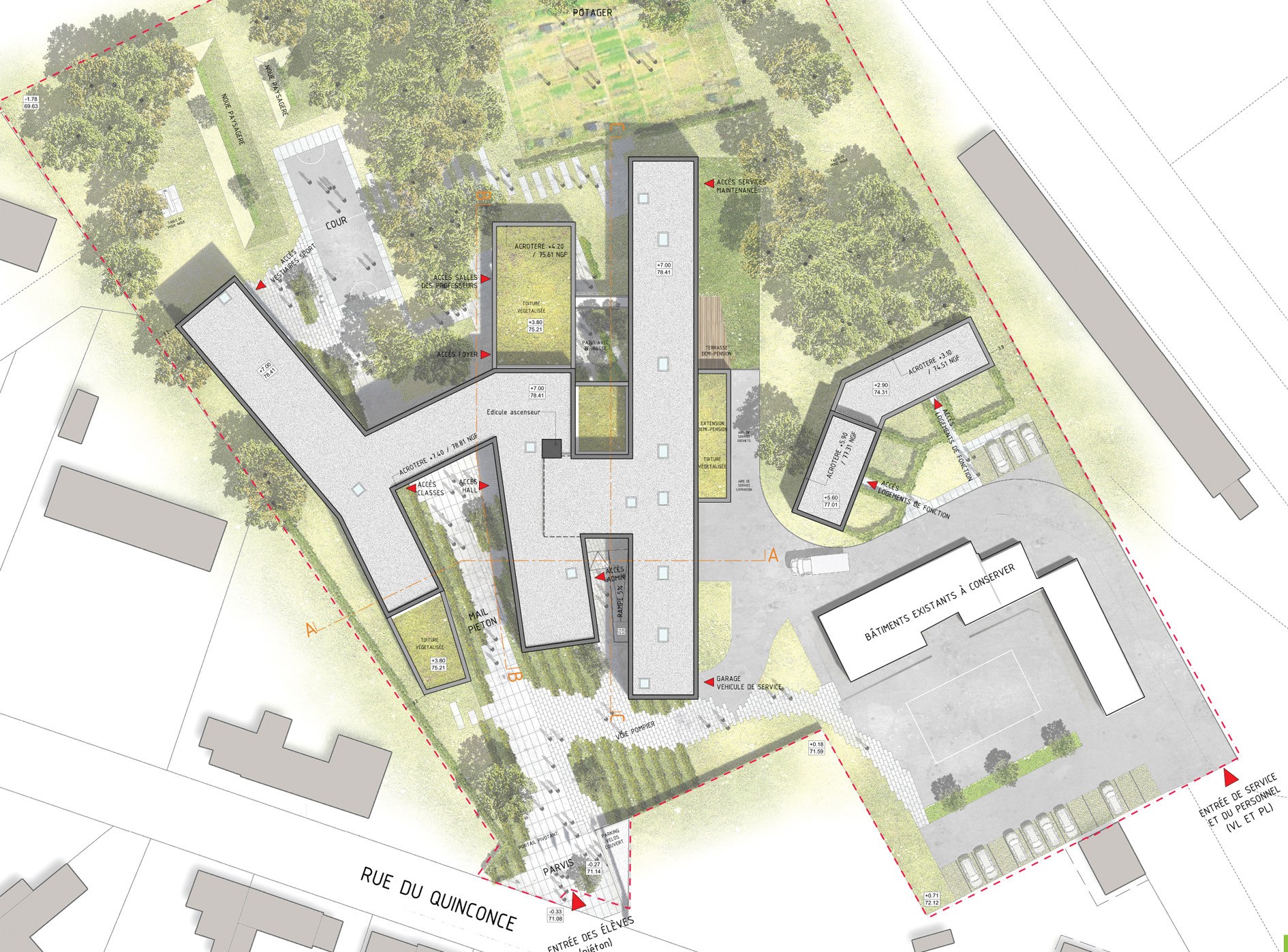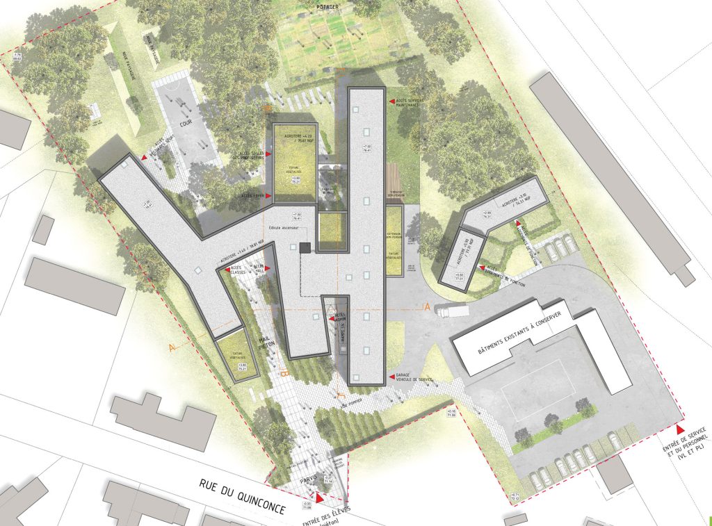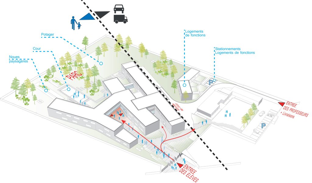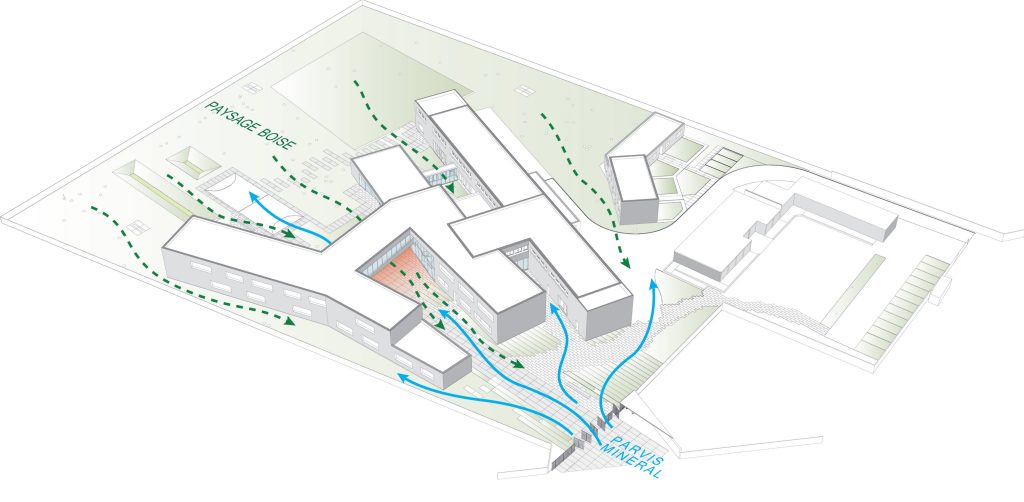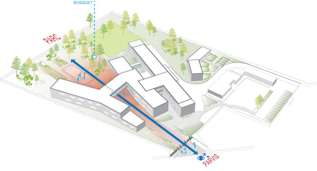 La composición se organiza en torno a un eje central que articula las diferentes funciones y espacios del instituto. Este espacio central contrasta con el resto del sitio, muy vegetalizado y en estrecha relación con los edificios. Canaliza y recoge todos los flujos peatonales, convirtiéndose en punto de referencia dentro del conjunto.