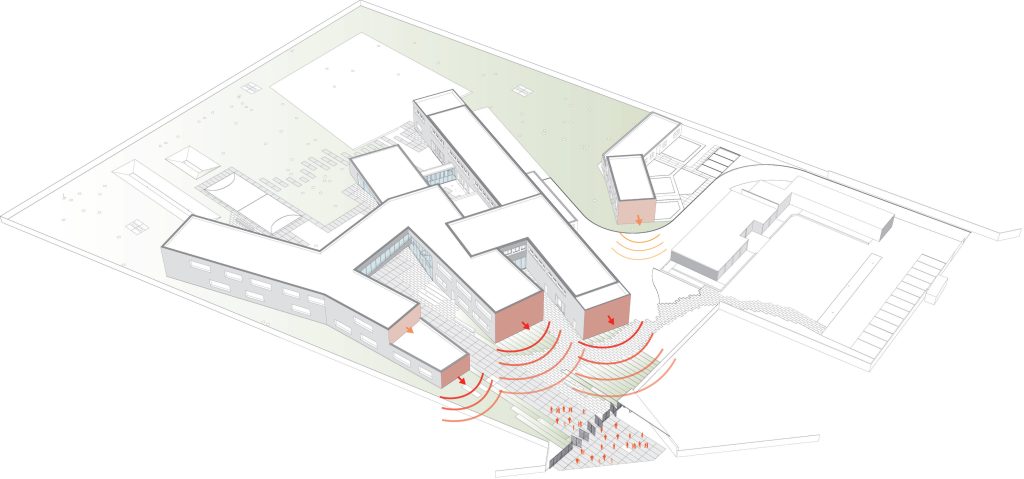 La entrada principal ofrece una atmósfera a la vez tranquila y acogedora, que invita al intercambio, la conversación y la pausa, pero también resulta dinámica en su forma y movimiento. El atrio es un espacio abierto, que facilita la lectura y comprensión del entorno. Destaca el edificio principal y conduce progresivamente a los usuarios hacia el eje principal.