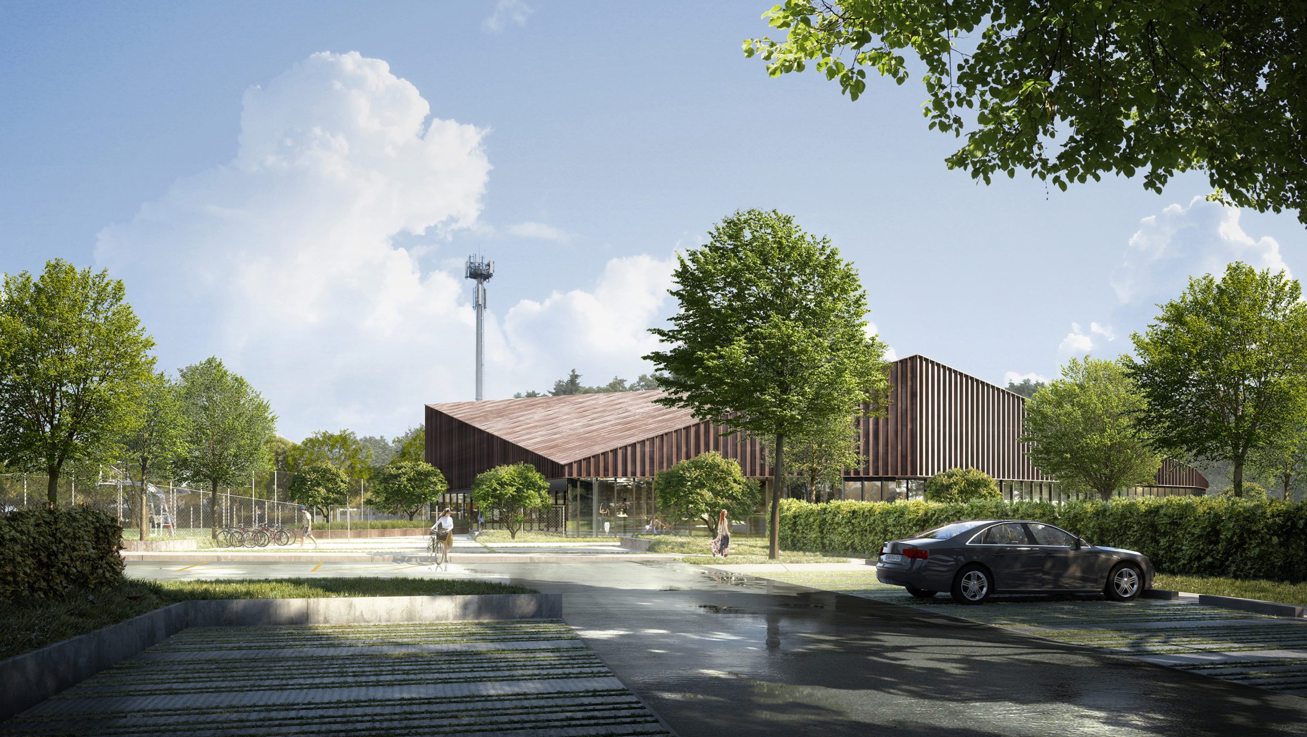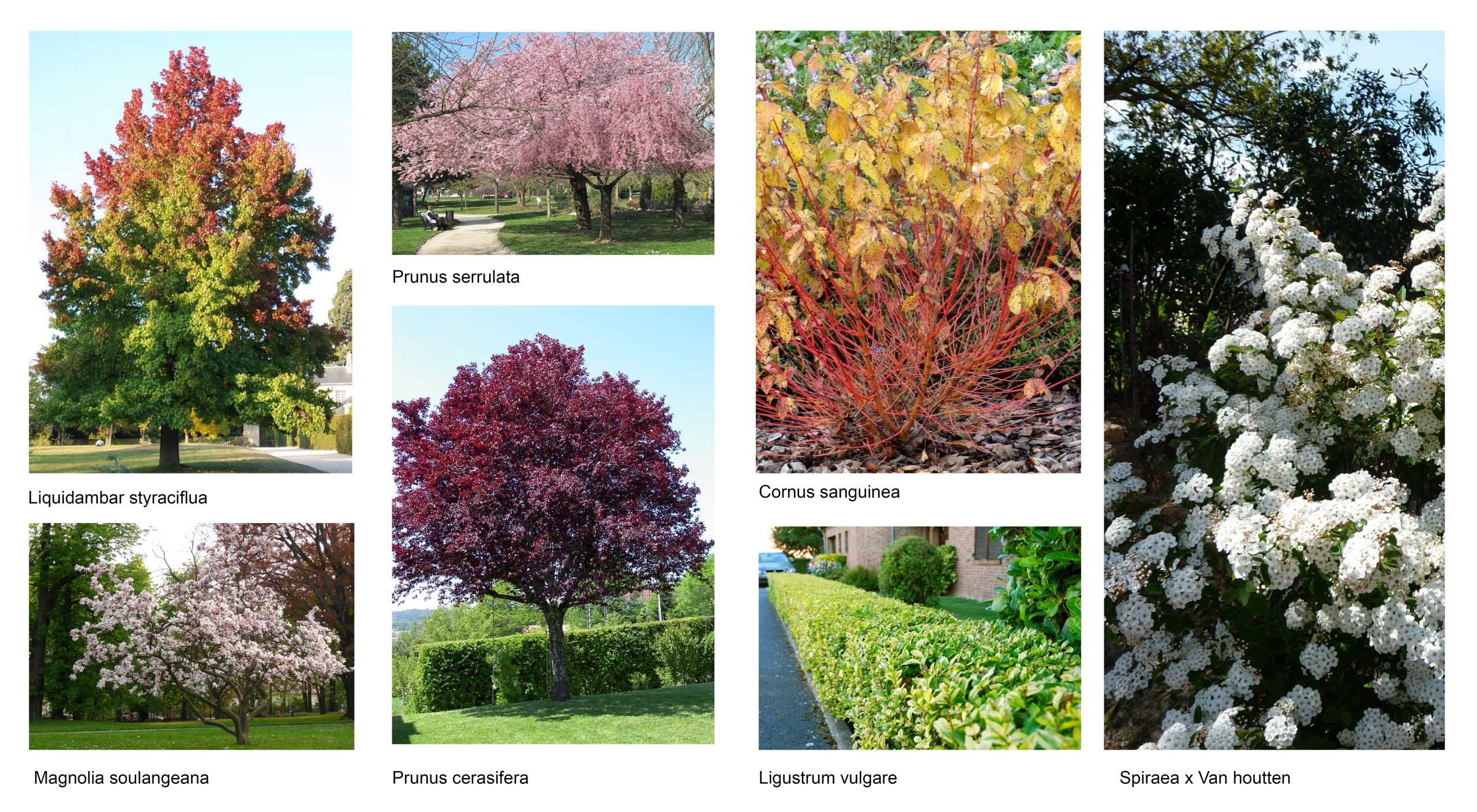 El estrato arbóreo está compuesto por árboles de tronco alto y desarrollo medio, con una altura de entre 10 y 15 metros (árboles de segunda altura). Las zonas de estacionamiento están bordeadas por un seto recortado de aligustre, carpe o haya, con una altura de 1,20 metros.