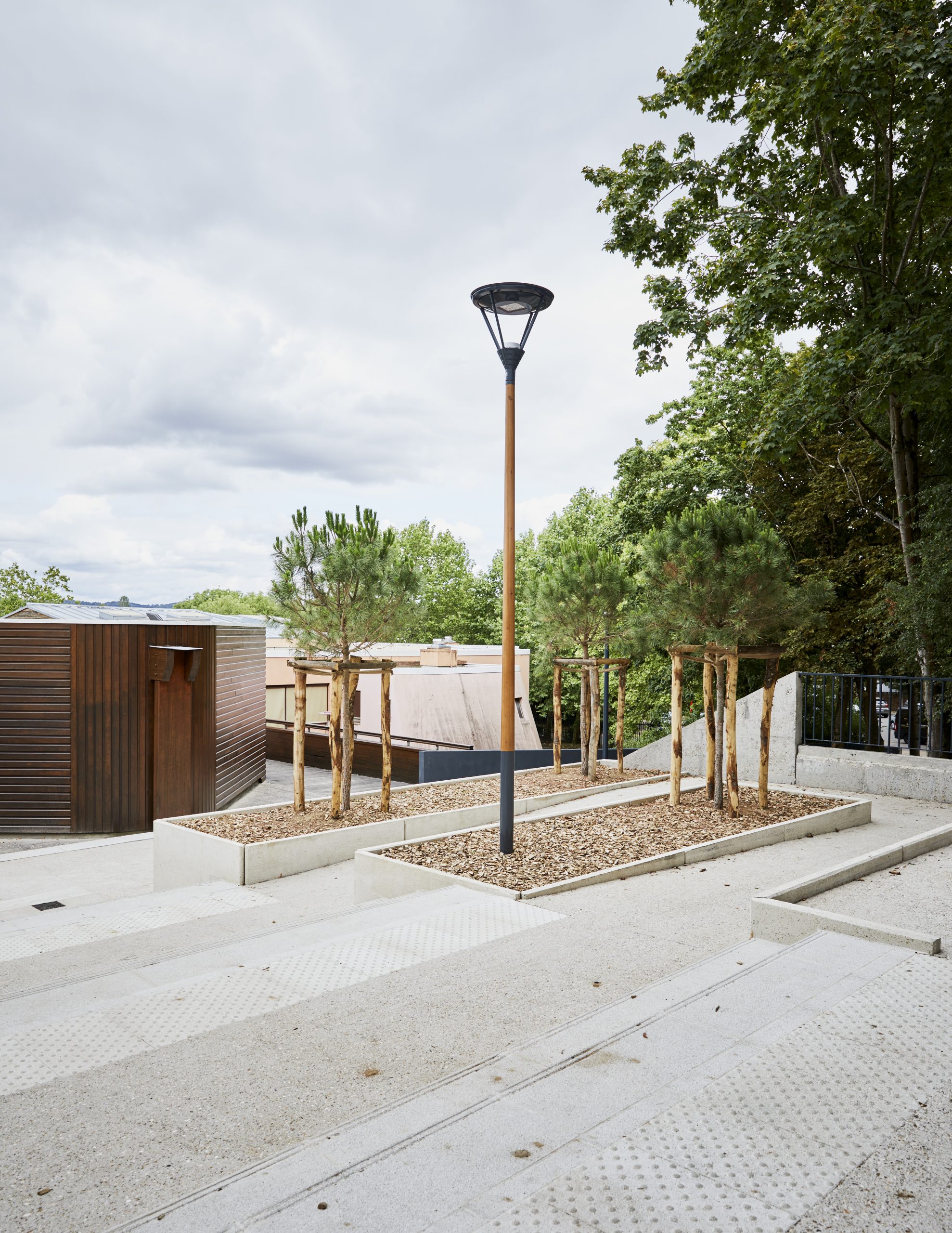 Pensé dans la continuité du plan d’ensemble de Val-de-Reuil, le projet s’attache à articuler les différents espaces selon leur caractère — plus intime pour les rues résidentielles, plus ouvert et fédérateur pour la place centrale. Les nouveaux aménagements associent revêtements qualitatifs, végétation urbaine et éclairage soigné, dans une démarche d’accessibilité universelle et de sobriété technique.