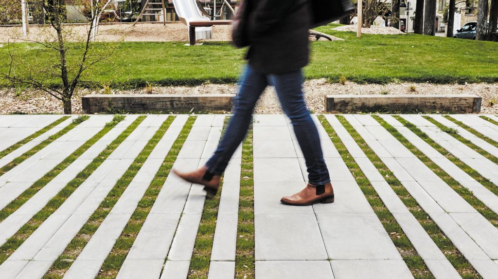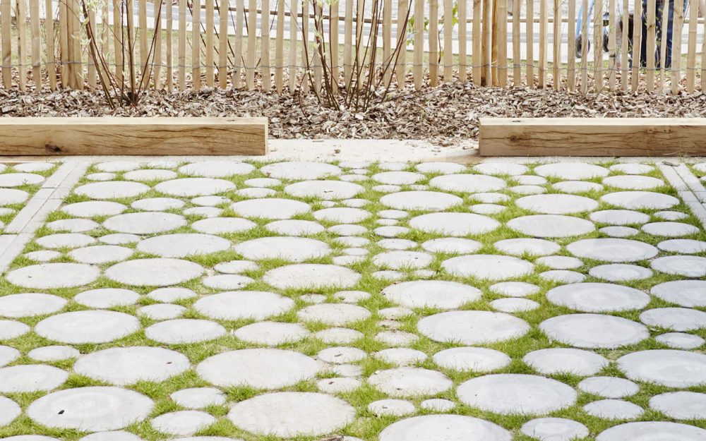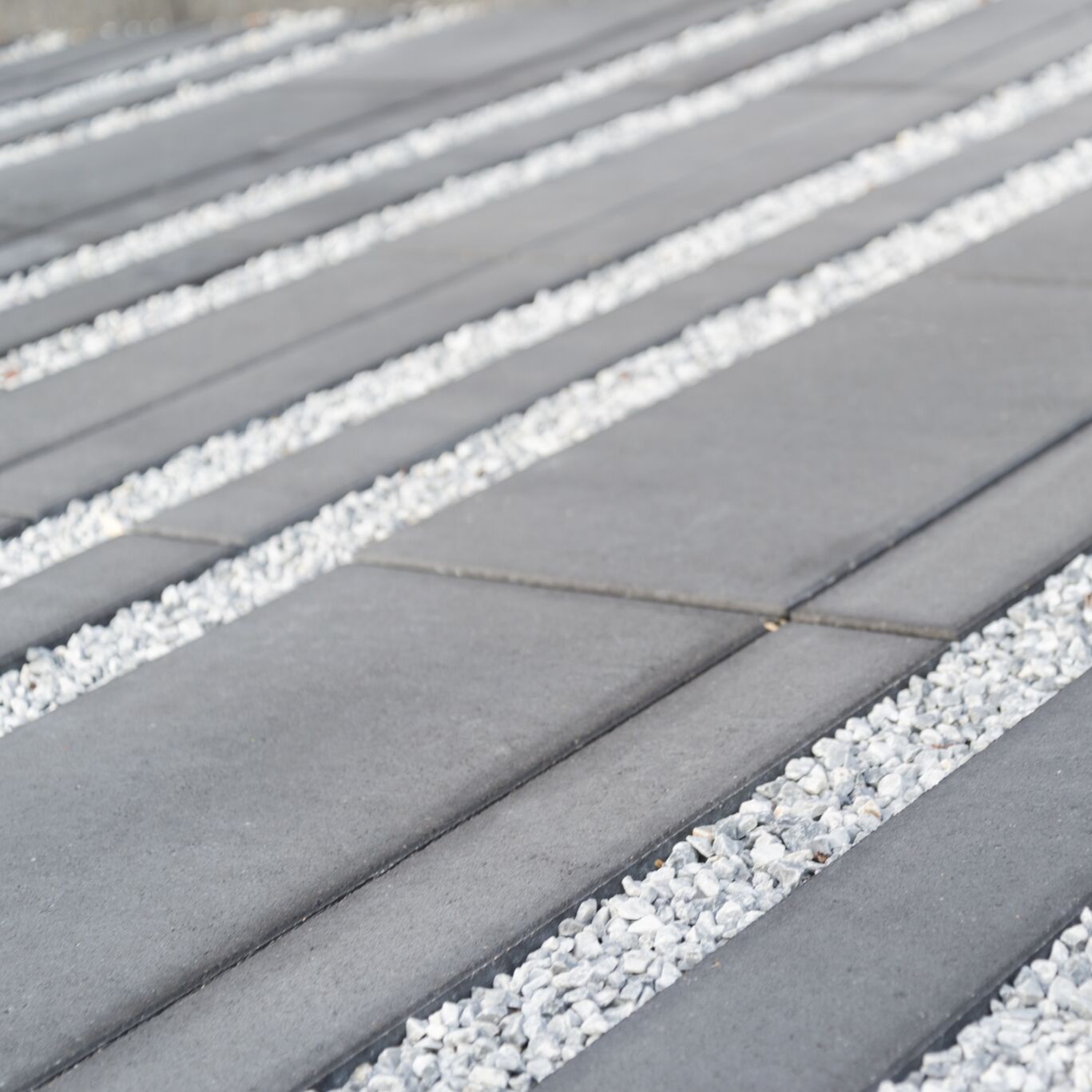 Au-delà de ses performances hydrauliques, Aviena se distingue par son potentiel de composition. Son dessin, proche d’une trame graphique ou d’un motif en “code-barres”, permet de générer une grande diversité d’ambiances, du plus minéral au plus végétal. Les joints peuvent être remplis de gazon, de graviers ou de matériaux drainants, offrant ainsi différentes lectures du sol et une capacité d’adaptation aux contextes urbains, paysagers ou hybrides.