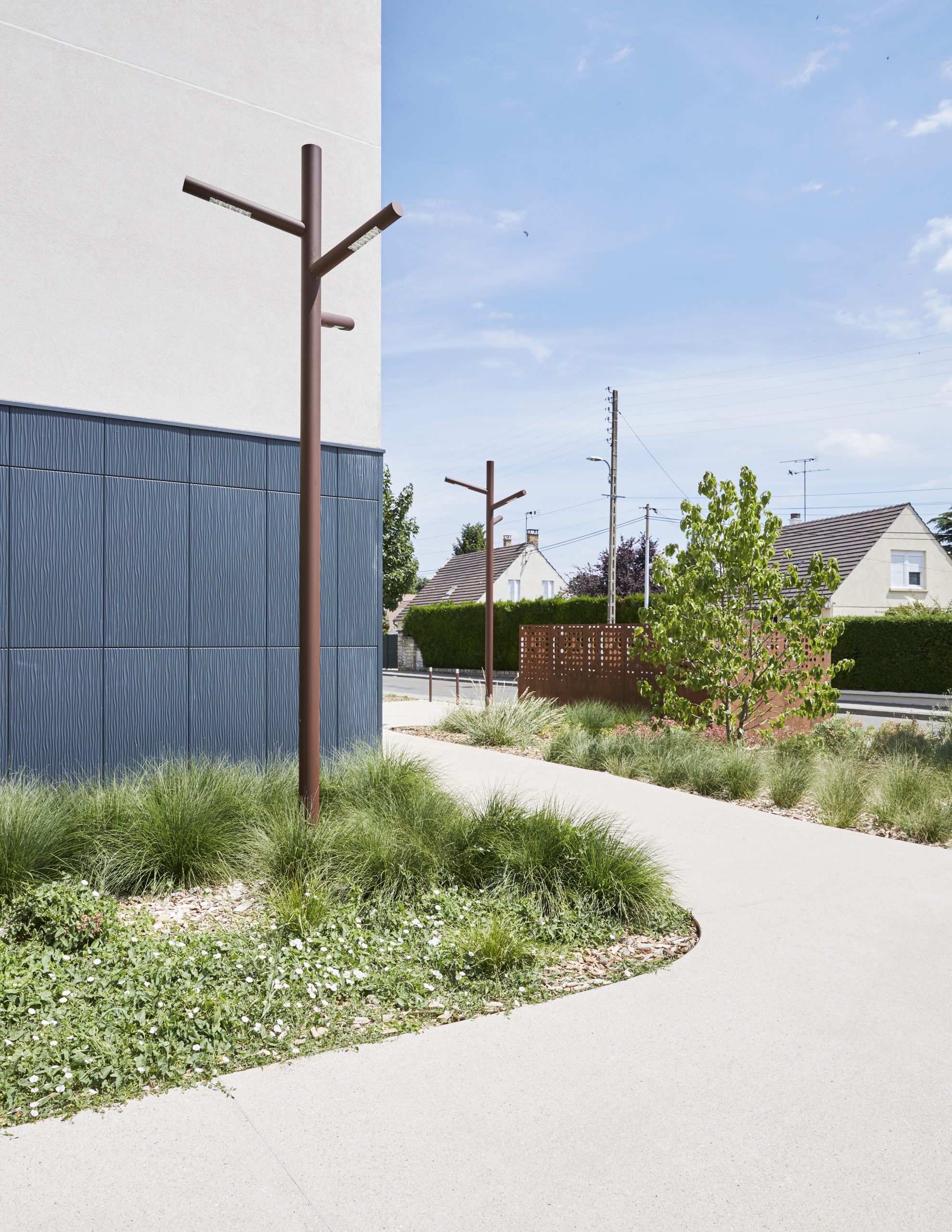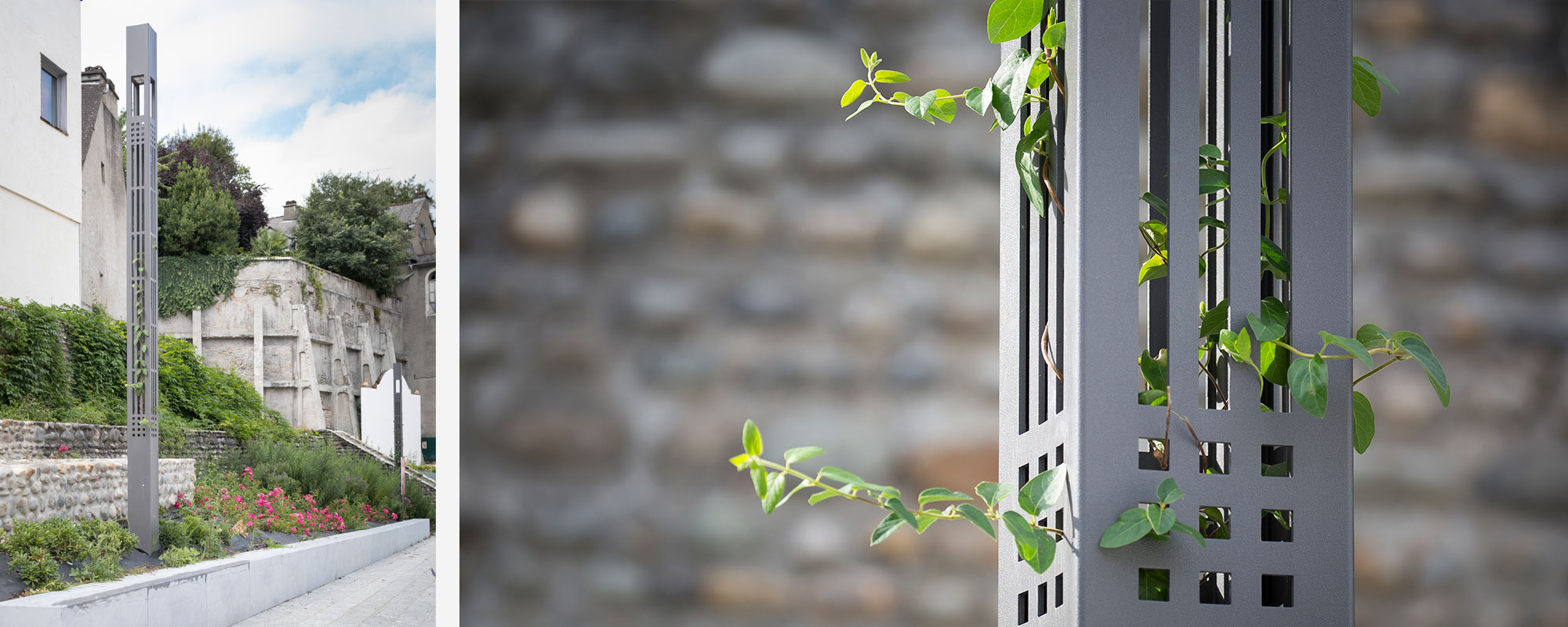 Dessiné par Maxime Saïsse et développé avec Technilum, Créil qui pousse propose une nouvelle manière d’envisager le mât d’éclairage comme élément de paysage. Inspiré des lignes de l’Art déco, il associe rigueur géométrique et légèreté graphique, affirmant une présence élégante et identifiable dans l’espace public. nSa structure ajourée permet l’intégration de plantes grimpantes, transformant le mât en support végétal. Cette capacité à accueillir le vivant réintroduit la nature au cœur des aménagements urbains et participe à la création d’ambiances sensibles et évolutives. La lumière, filtrée par les motifs perforés, génère un éclairage décoratif subtil qui enrichit la perception nocturne des lieux.