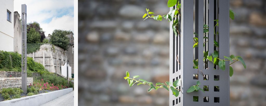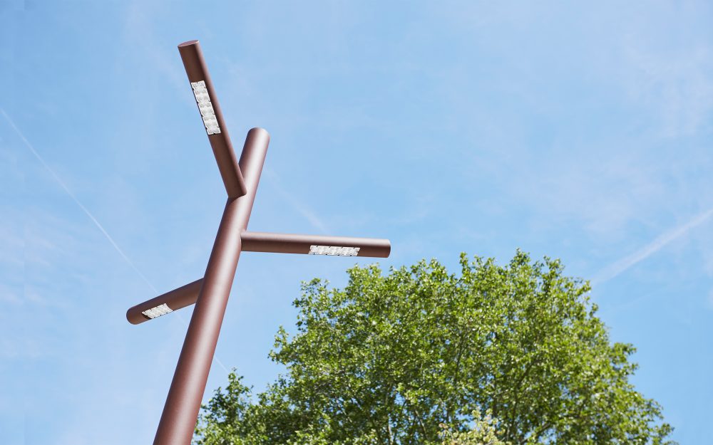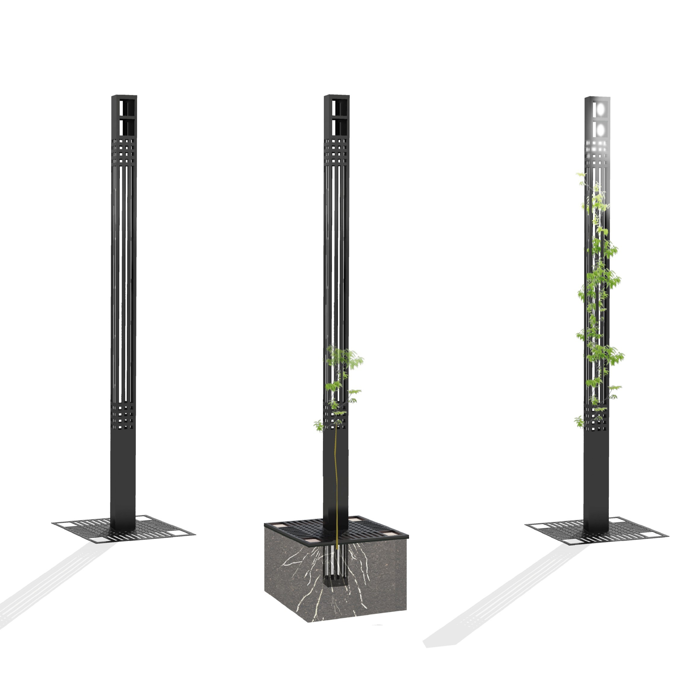 Son dessin élancé évoque la verticalité de l’arbre. La structure ajourée, inspirée du feuillage et des ramures, crée une présence légère et graphique. Cette porosité permet l’installation de plantes grimpantes, transformant progressivement le mât en support végétal. Arbane participe ainsi à la réintroduction du vivant en ville et à la création d’ambiances évolutives au fil des saisons, renforçant le lien entre usagers et environnement.