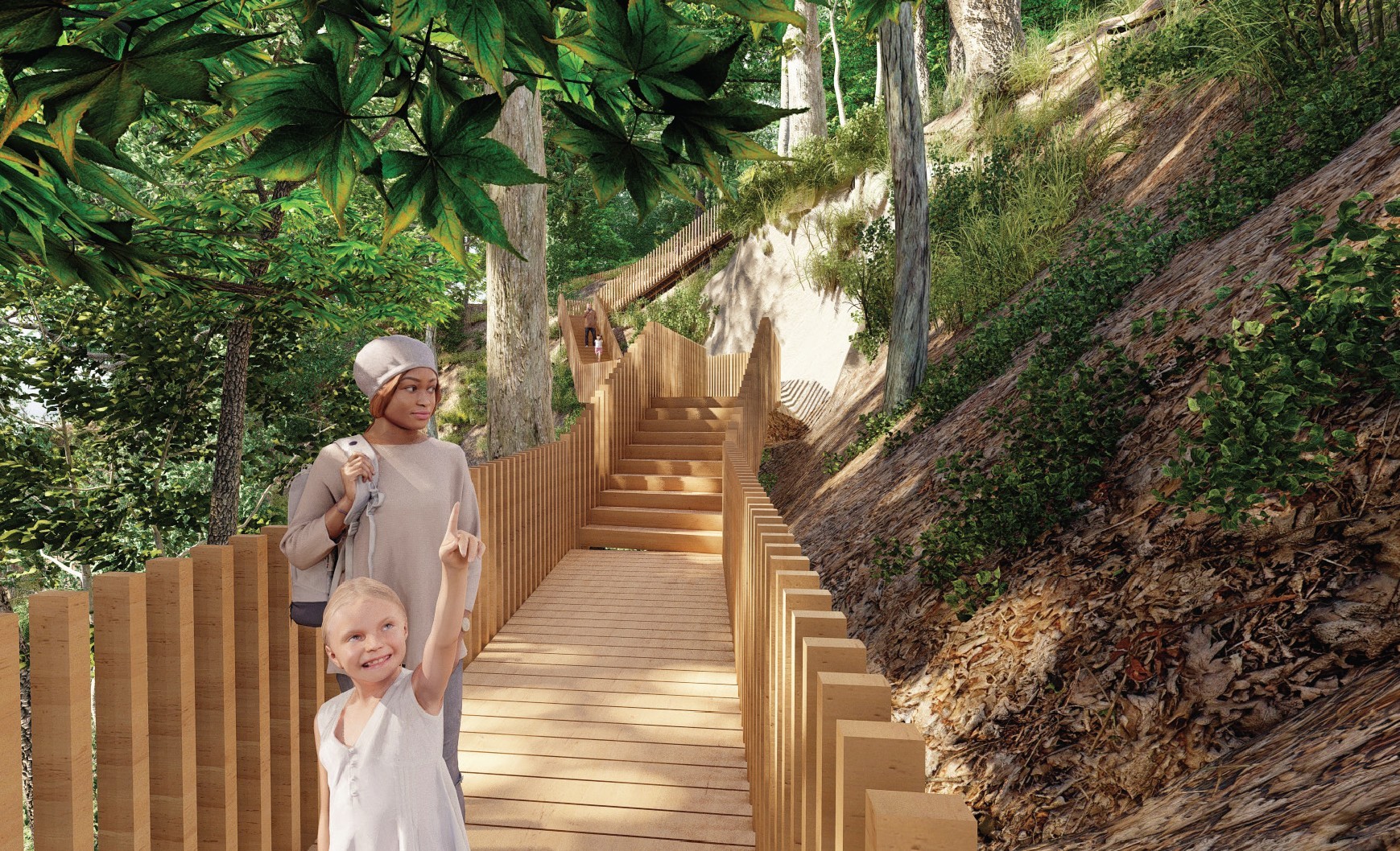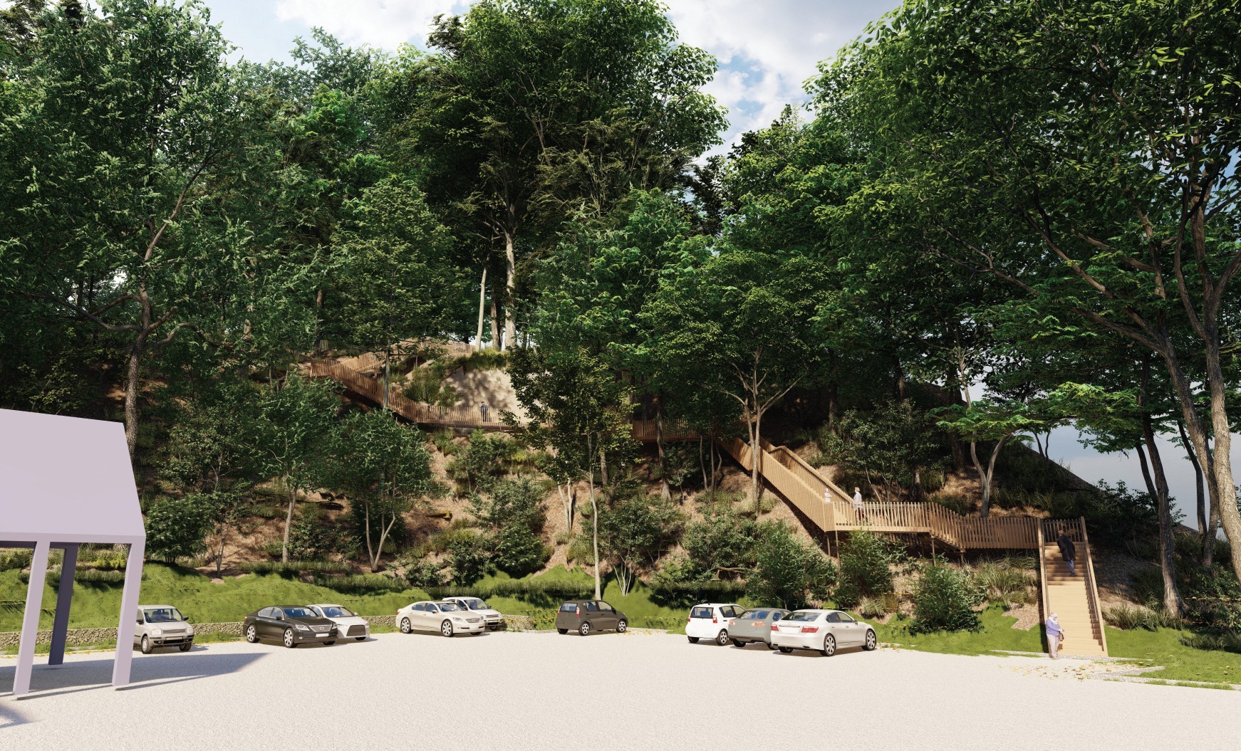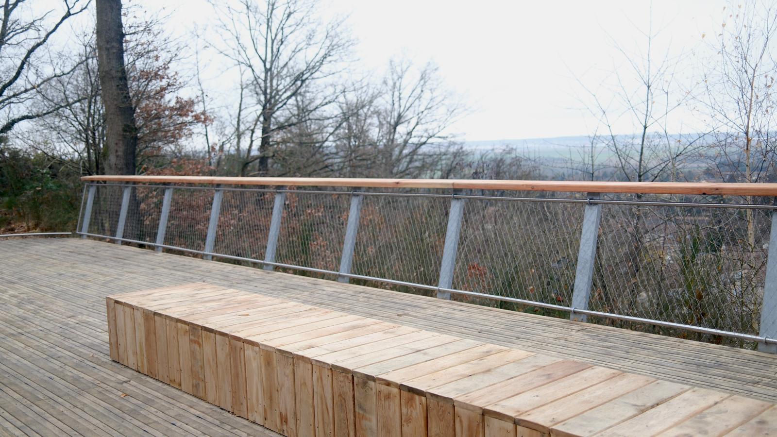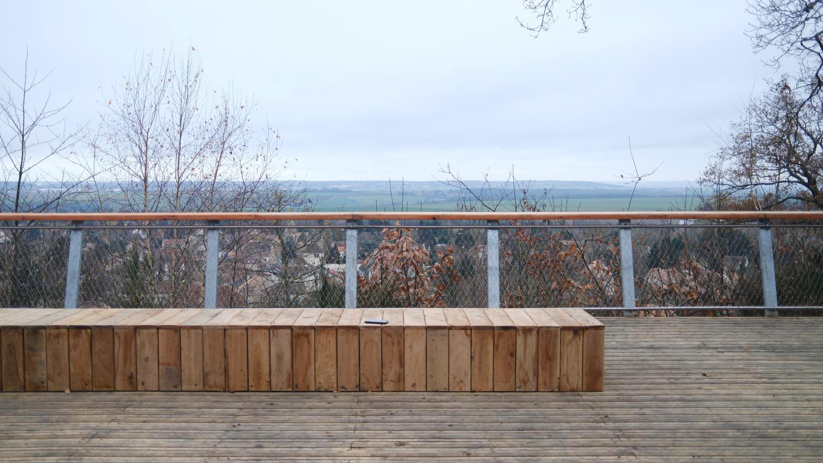 Le projet se prolonge vers la lisière forestière avec la création d’un belvédère léger, intégré au relief, offrant des vues sur le village et la plaine de Versailles. Le parcours est conçu pour être accessible à tous. Une table d’orientation pédagogique valorise l’histoire et la géographie du site, sans terrassements lourds afin de préserver l’intégrité naturelle du coteau.