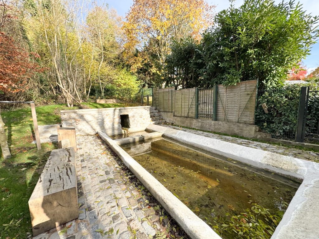 La première intervention restaure la source et son environnement immédiat. Un pavage en pierre, en lien avec le caractère patrimonial du lieu, redonne lisibilité à l’ensemble. Les ronces sont supprimées, les maçonneries restaurées, et des bancs intégrés au terrain accompagnent une nouvelle plantation structurante au cœur de la prairie.