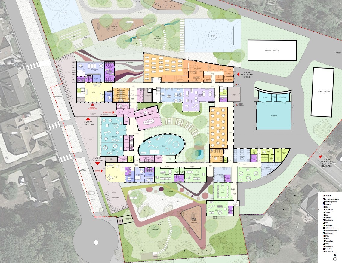 L’organisation fonctionnelle s’inspire du principe du déambulatoire : la circulation principale du rez-de-chaussée se développe autour du patio et dessert l’ensemble des espaces. Bien que reliées par cette circulation centrale, les différentes entités – maternelle, élémentaire et périscolaire – conservent leur autonomie.