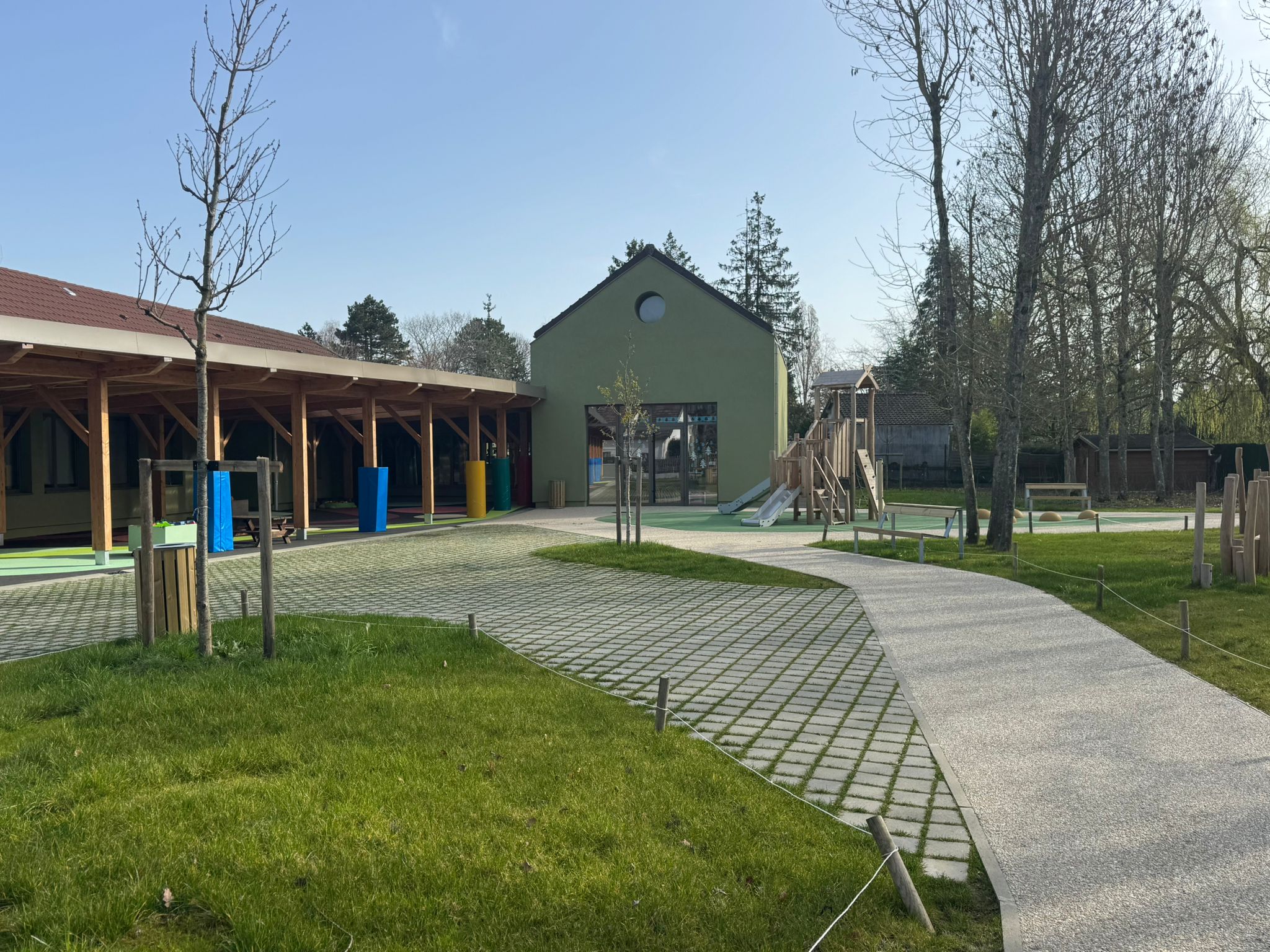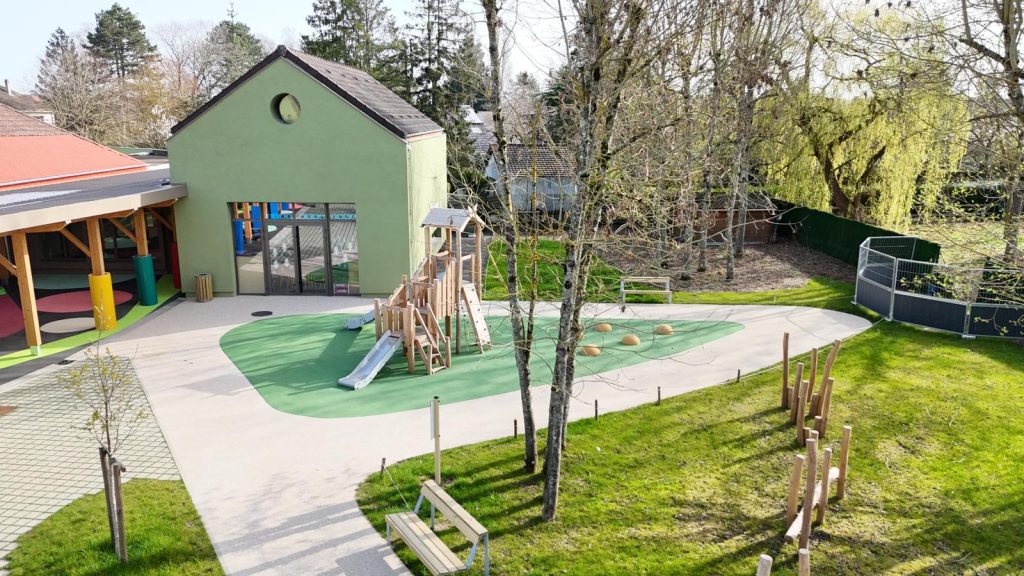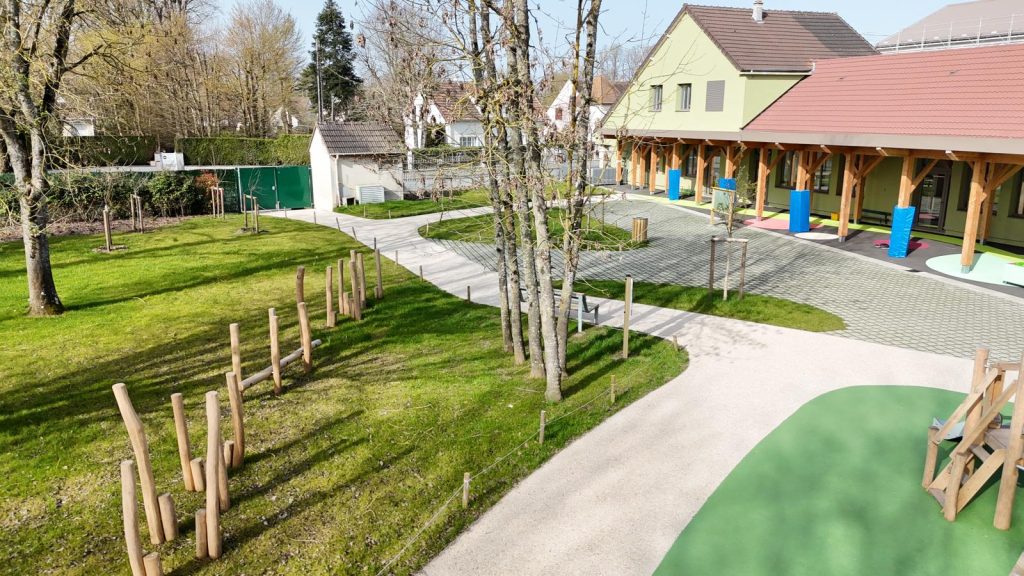 Un patio a été créé au cœur de l’ensemble. Véritable havre de calme et de verdure, il offre un espace extérieur protégé des nuisances et accessible à tous. Ce jardin intérieur éclaire naturellement les circulations et les locaux qui l’entourent, notamment les salles de motricité, la salle de réunion du périscolaire, la salle à manger de la maternelle et le CDM.