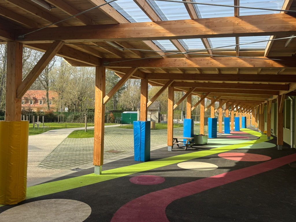 Trois entrées principales, distinctes, desservent respectivement l’école élémentaire, la maternelle et le périscolaire. Elles s’ouvrent sur un parvis couvert par une large toiture qui abrite les flux piétons et unifie les différentes composantes du programme. Accessible directement depuis la voie publique, cet espace d’accueil exprime les valeurs de l’enseignement public : protection, ouverture, mixité et partage.