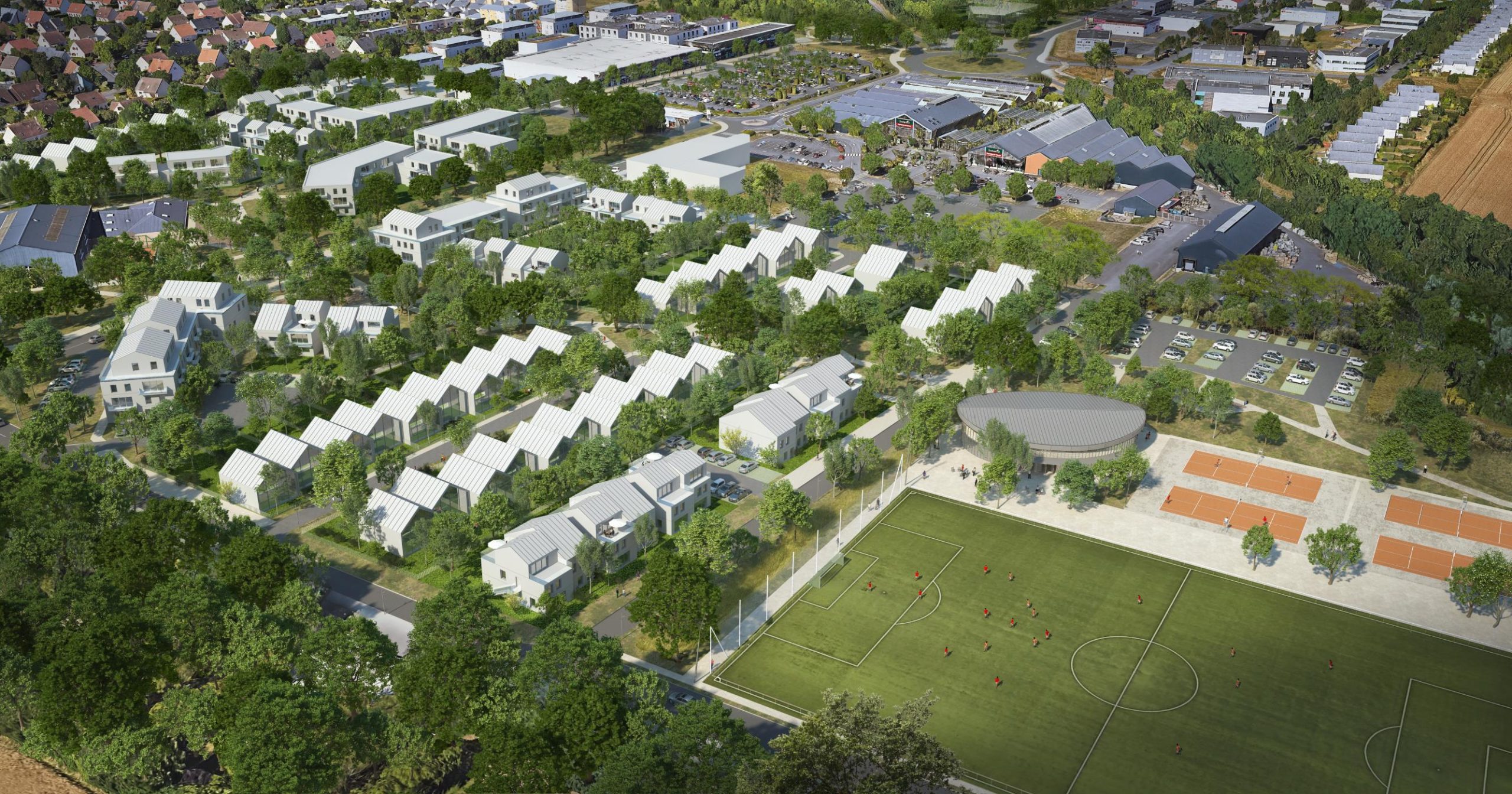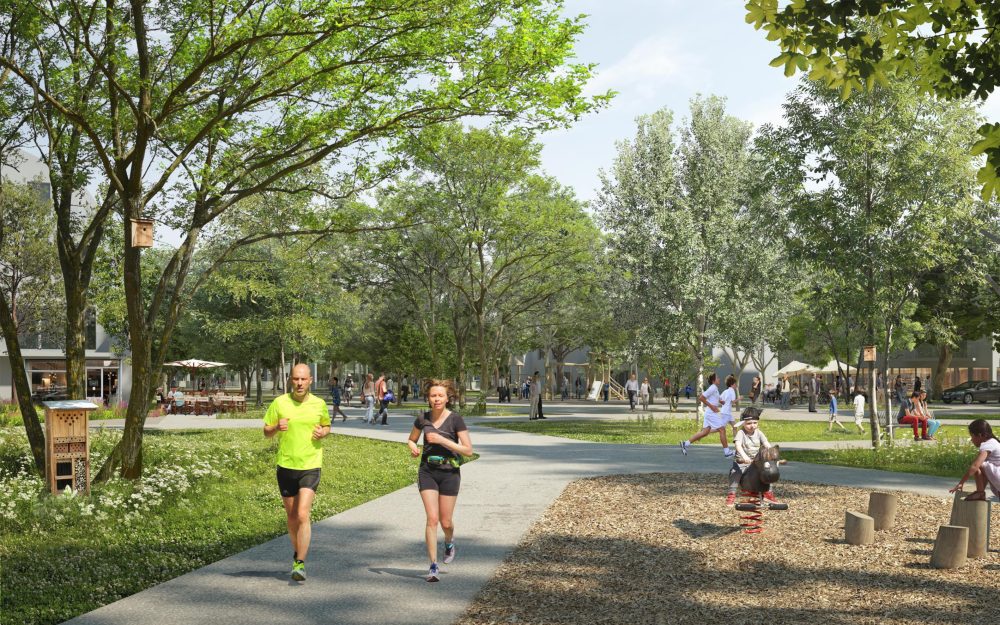 La stratégie paysagère s’inscrit dans une logique de sobriété et de ressources locales, jusqu’à proposer une pépinière éphémère dédiée à la production des arbres et plantes nécessaires à la ZAC : circuit court, végétaux acclimatés, meilleure reprise, et dimension pédagogique. Louvigny est pensé comme un quartier où le paysage structure la forme urbaine, organise les mobilités, soutient la biodiversité et fabrique un cadre de vie actif, partagé et résilient.