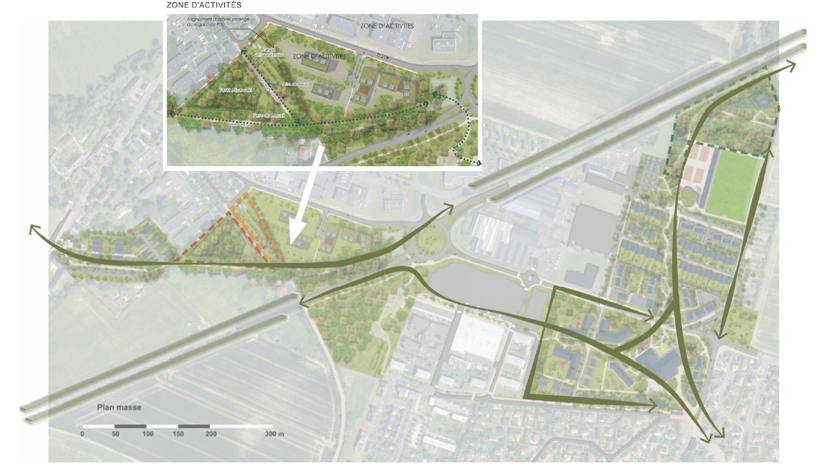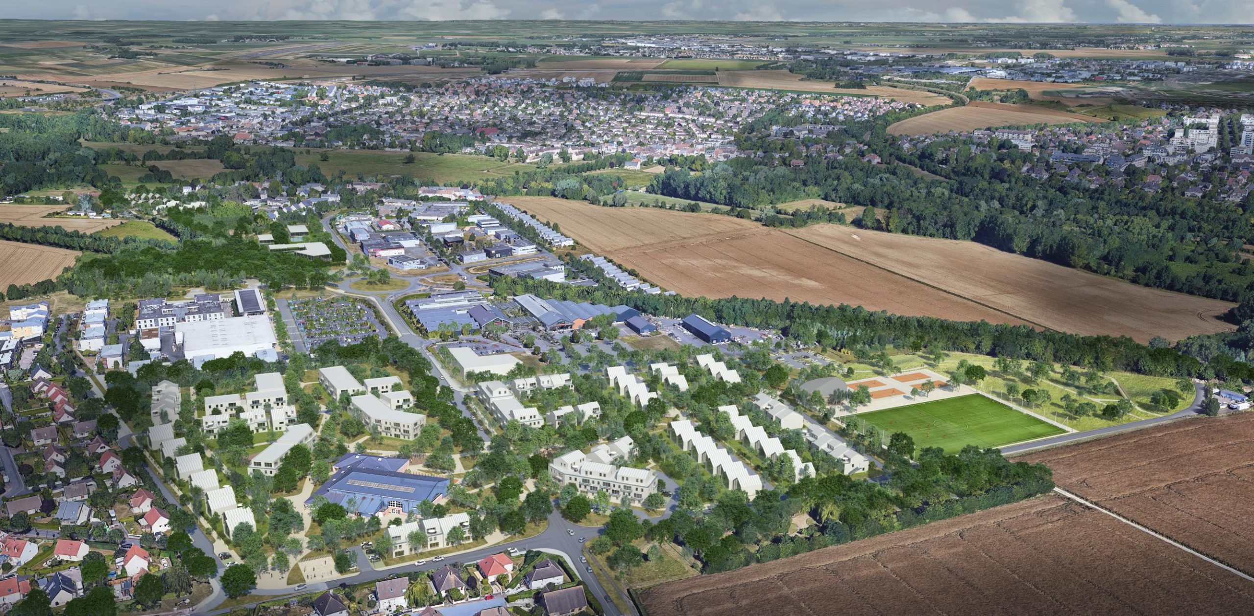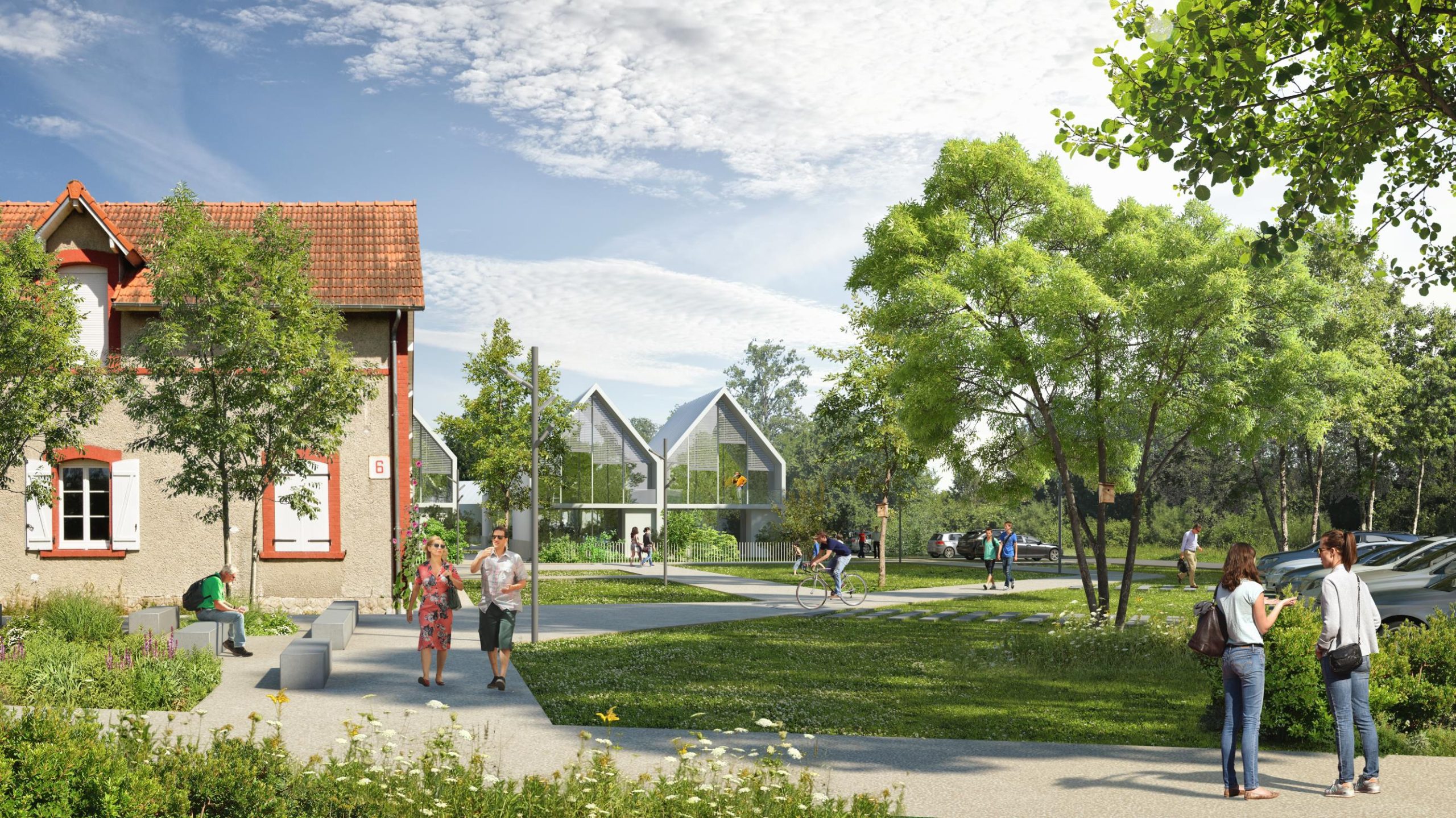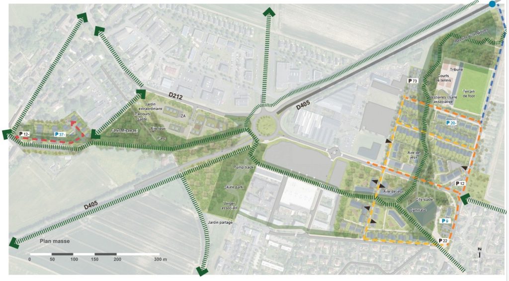 L’armature des espaces extérieurs s’organise en dorsale de parcs ruraux et forestiers qui relie le centre du village, la voie verte du Hameau du Mesnil et la rivière de l’Odon. Ce réseau forme un “fil vert” continu, structurant et agréable, qui connecte logements, équipements et lieux de loisirs en privilégiant les déplacements doux.