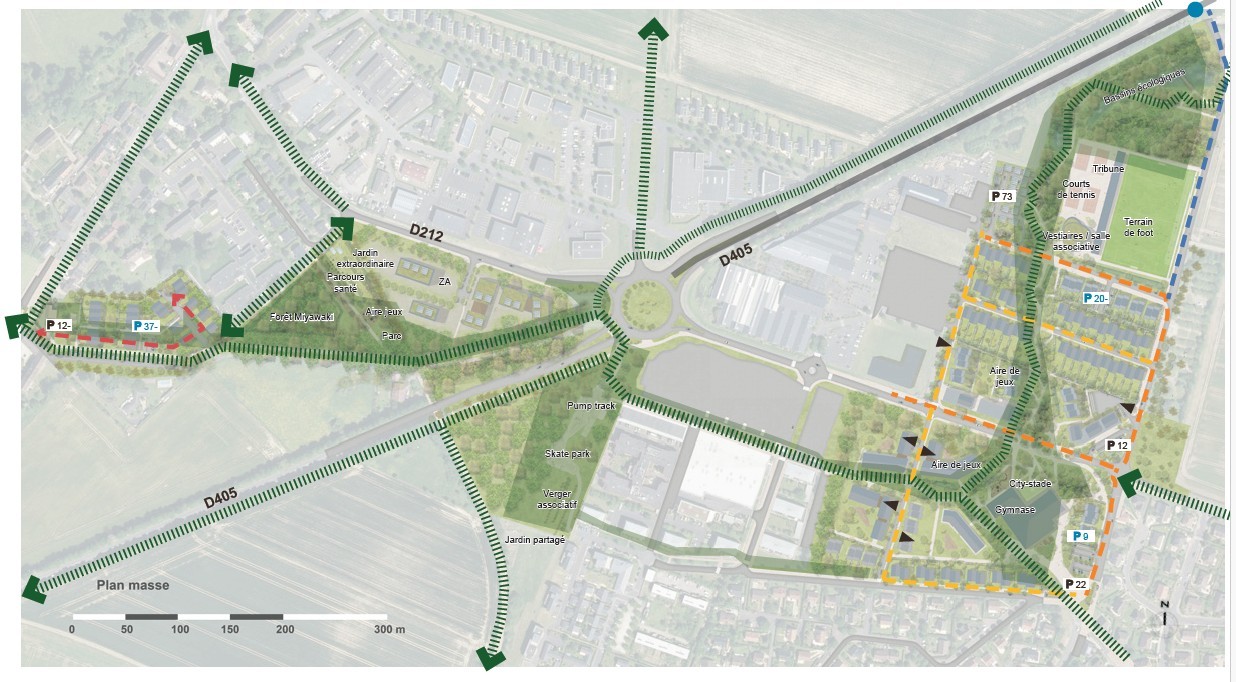 À l’échelle du quartier, cette trame se décline en grands ensembles paysagers identifiés : un parc d’environ 1,7 ha, un Jardin extraordinaire (≈ 1 800 m²) et une forêt Miyawaki (≈ 3 000 m²), renforçant l’identité d’“écohameau” et la présence du vivant au coeur du projet. Le projet donne une place centrale à l’eau comme composante de paysage, avec une gestion intégrée des eaux pluviales visant l’objectif “zéro tuyau” : l’infiltration est privilégiée au plus près de la pluie, au sein de noues végétalisées qui bordent les voiries et participent à la fois au confort d’usage, à la dépollution naturelle et à la création de milieux frais favorables à la biodiversité.
