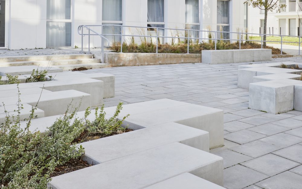 Le projet paysager privilégie des essences adaptées au contexte local, favorisant la résilience écologique et limitant les besoins d’entretien. L’ensemble compose aujourd’hui un cadre de vie durable, où architecture et paysage participent conjointement à la transformation du site en un quartier vivant et attractif.