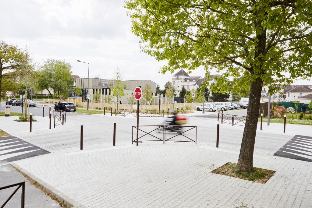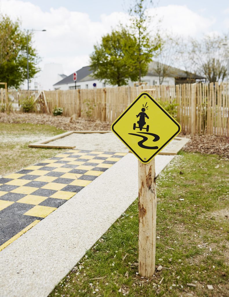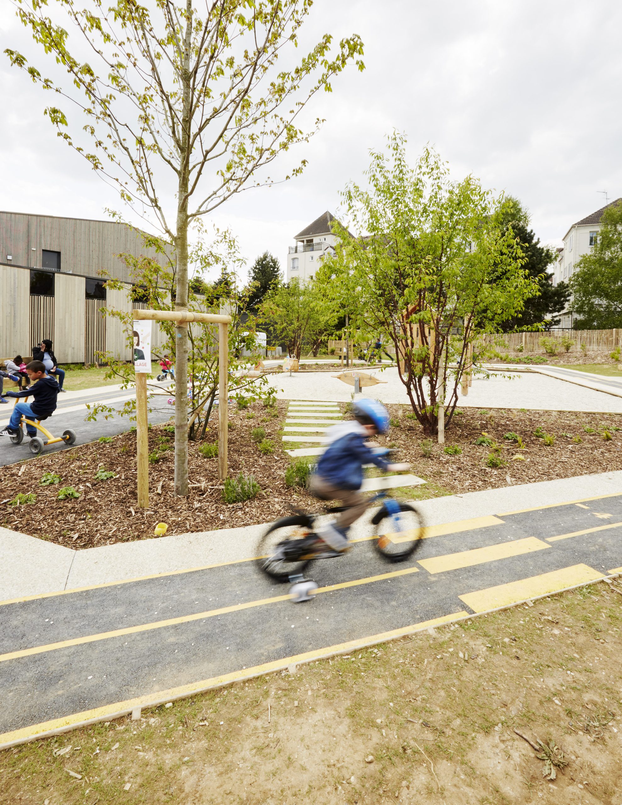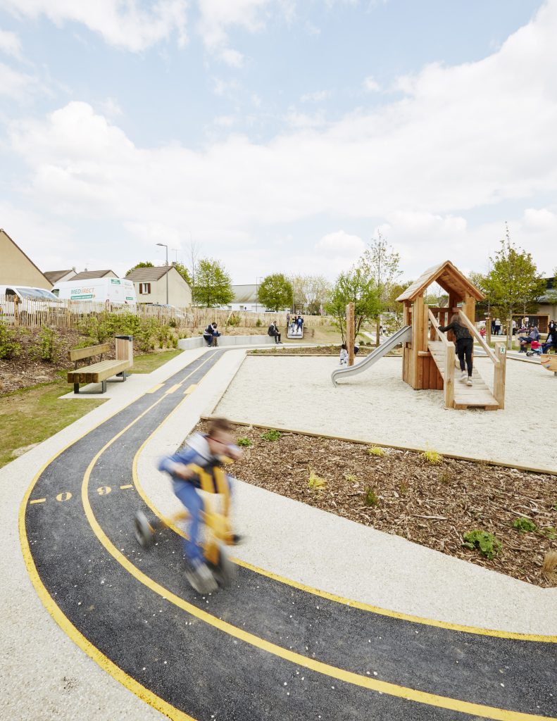 Le projet s’organise autour d’une piste circulaire qui structure l’ensemble de l’espace. Symbole du parcours, de la déambulation et du jeu, cette boucle est animée par des marquages au sol graphiques et ludiques qui invitent au mouvement et à l’appropriation. Elle distribue différents éléments de mobilier et de petites séquences d’usages : bancs, coin goûter, cabane à tricycles, boîte à livres, fontaine à eau ou encore espaces engazonnés propices au repos.