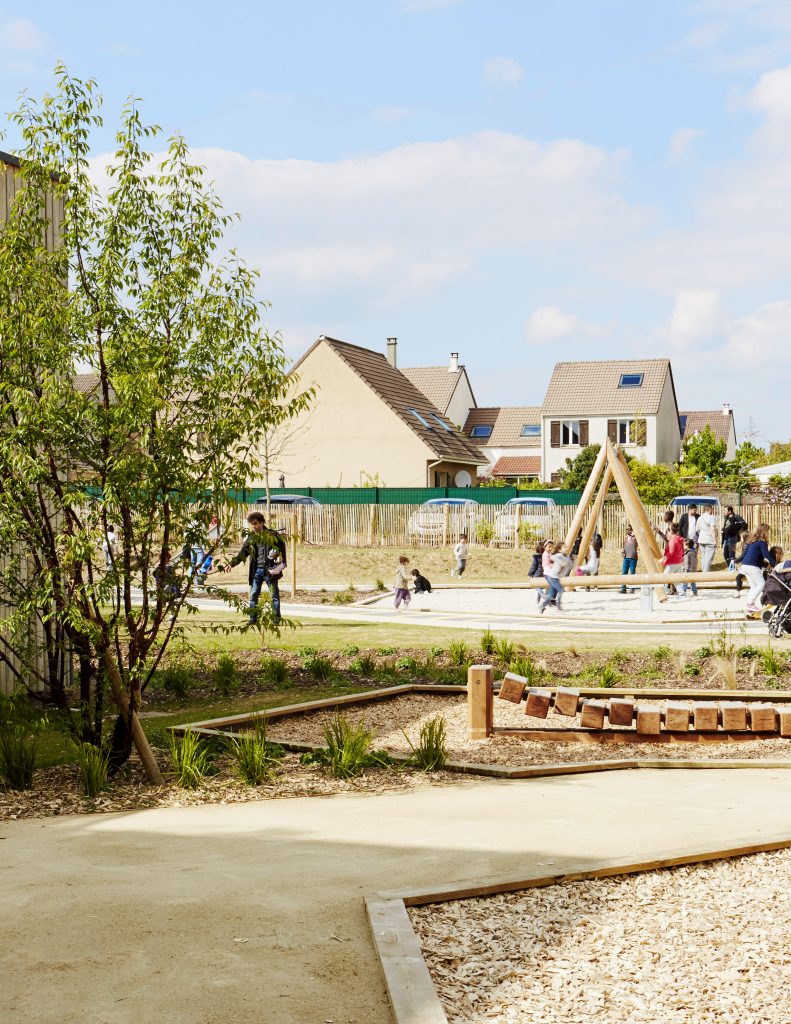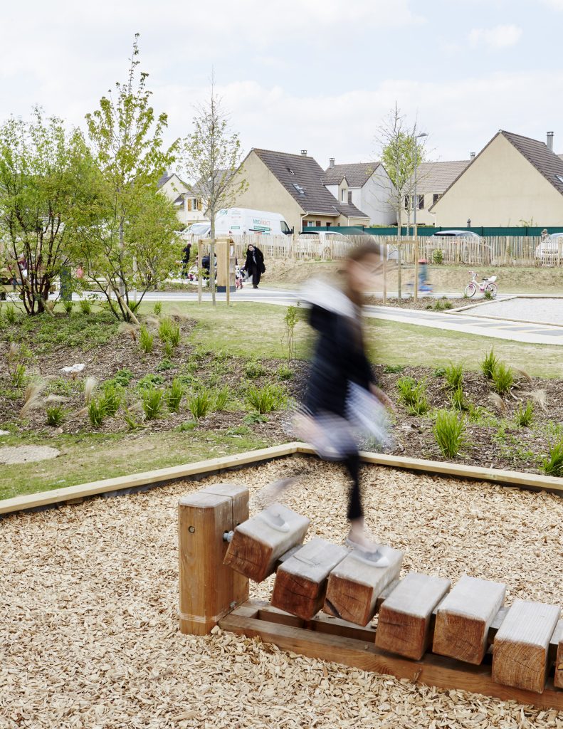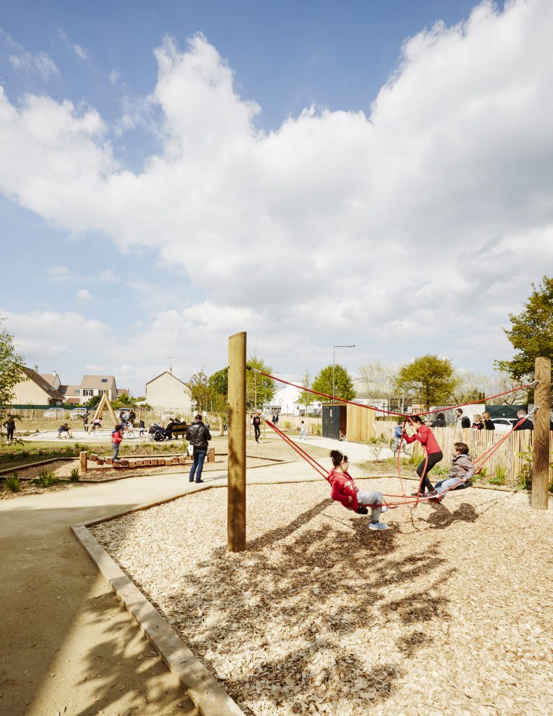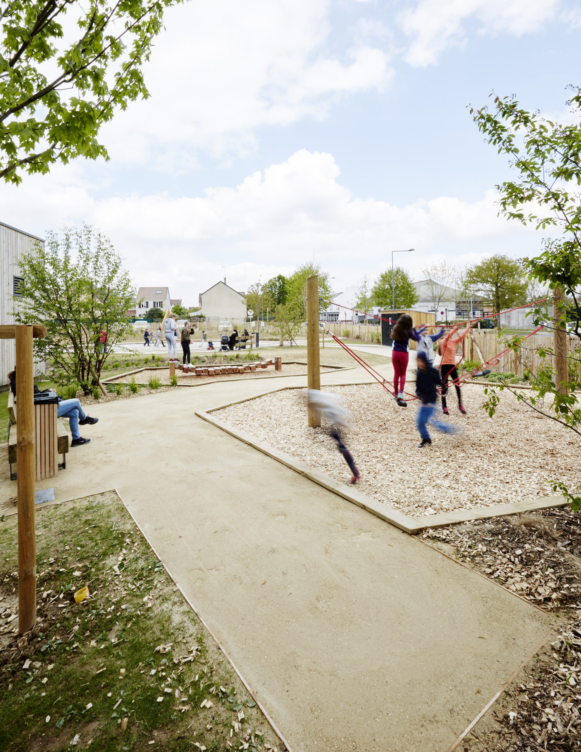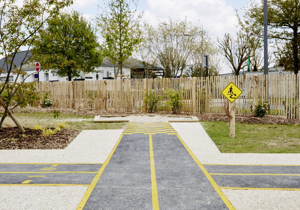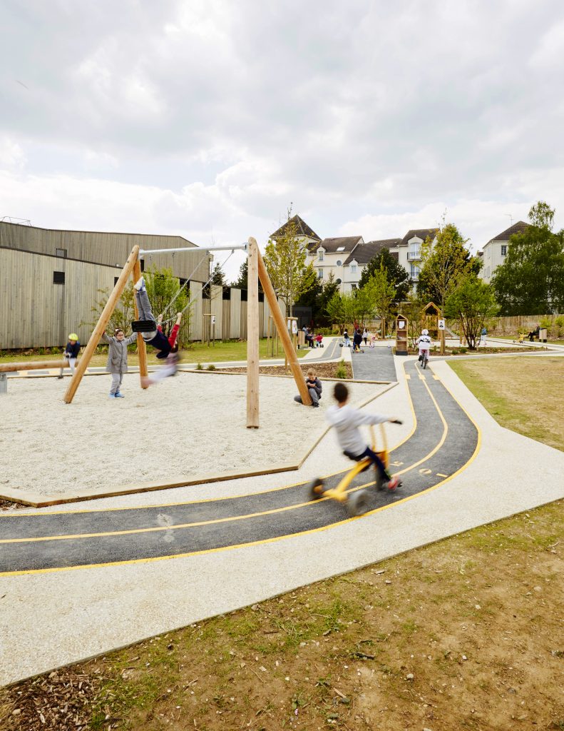 Les aires de jeux prennent place à l’intérieur de cette boucle, formant deux séquences ludiques reliées entre elles par un « tableau noir » au sol réalisé en enrobé fin. Cet espace devient un support d’expression graphique, invitant les enfants à dessiner et à s’approprier librement le lieu.