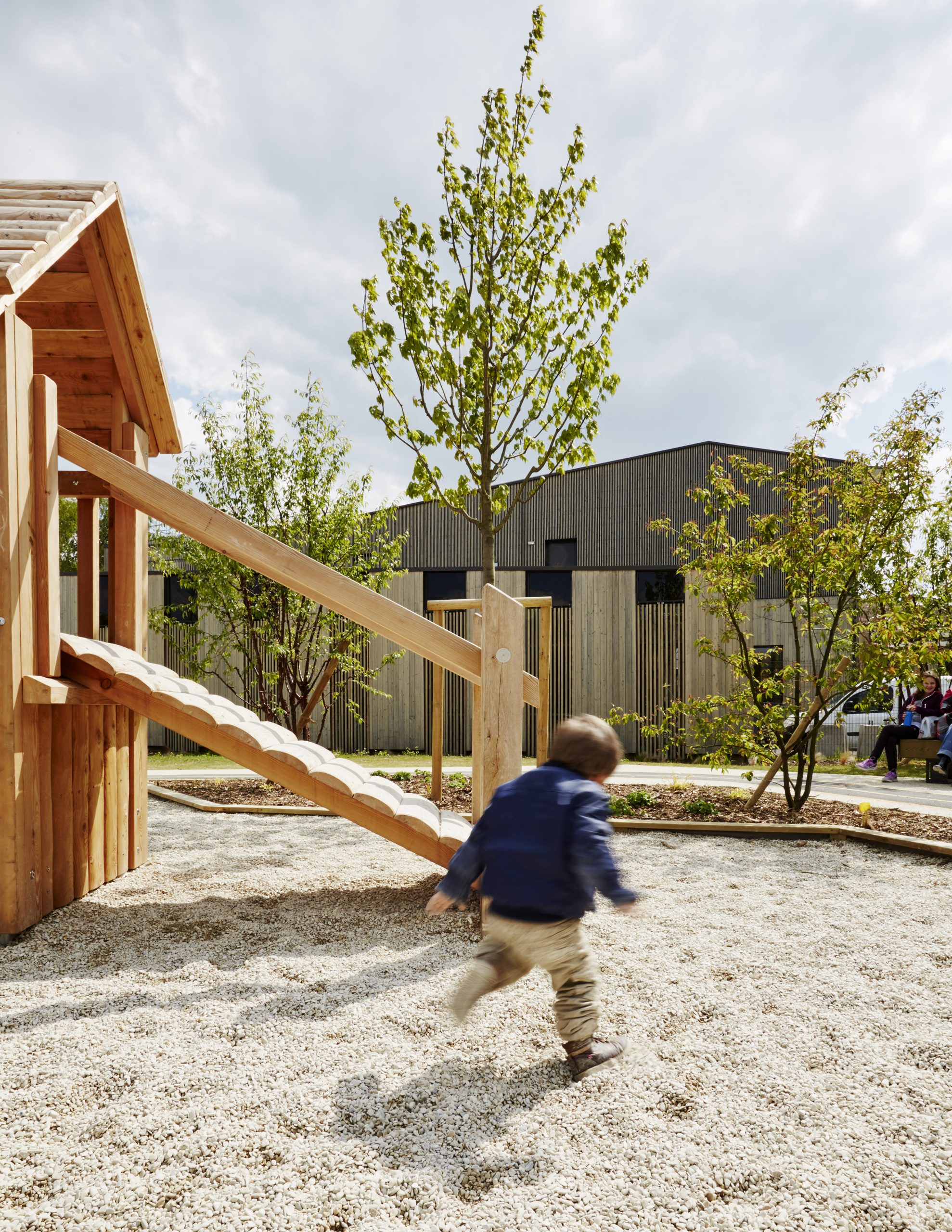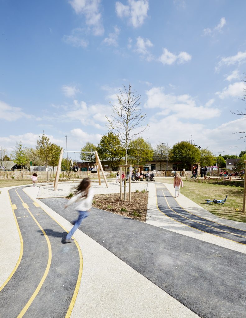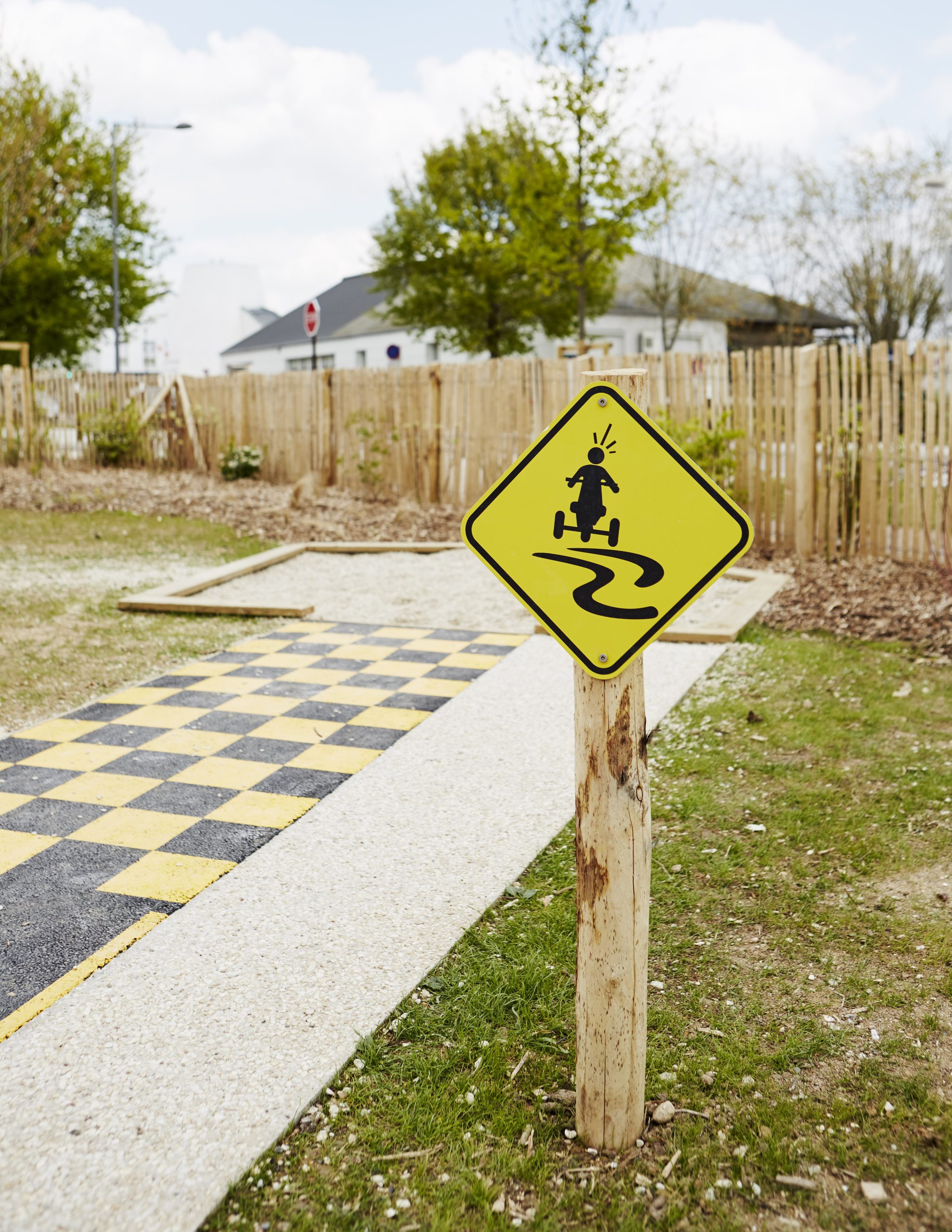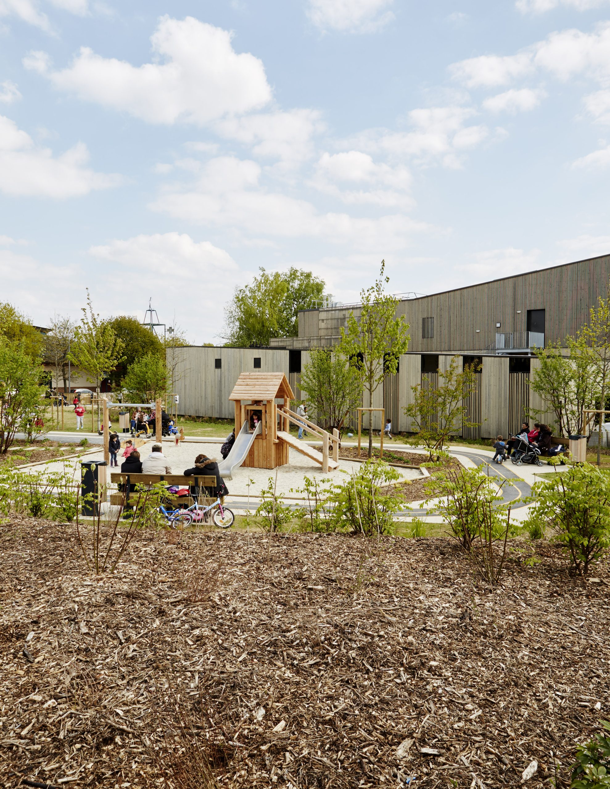 Les aires de jeux prennent place à l’intérieur de cette boucle, formant deux séquences ludiques reliées entre elles par un « tableau noir » au sol réalisé en enrobé fin. Cet espace devient un support d’expression graphique, invitant les enfants à dessiner et à s’approprier librement le lieu.