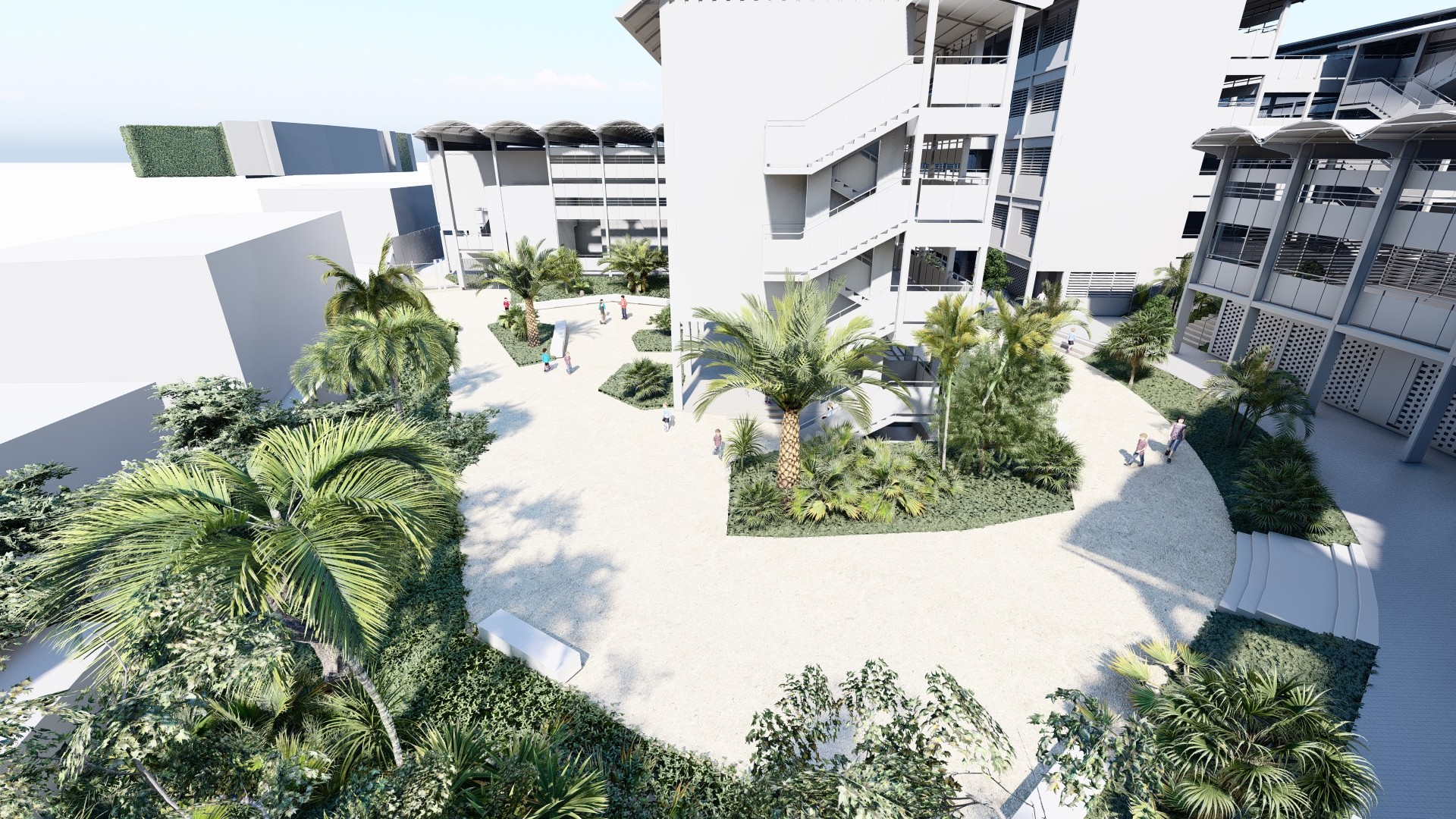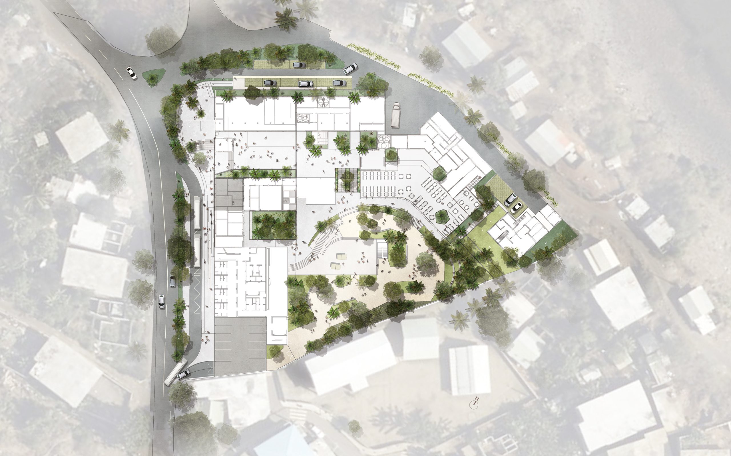 Implanté dans le paysage insulaire de Mayotte, le projet paysager du lycée de Bandradoua s’inscrit dans une démarche attentive au contexte naturel et climatique du site. L’intervention cherche à valoriser les qualités paysagères existantes en s’appuyant sur la végétation déjà présente – manguiers, jacquiers et cocotiers – qui constitue la structure vivante du projet et participe à l’identité du lieu.