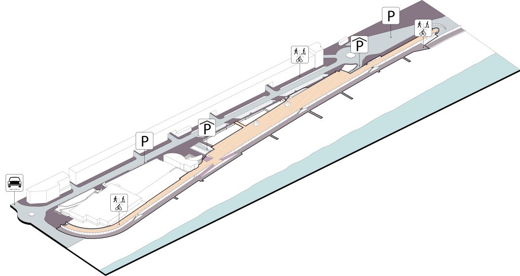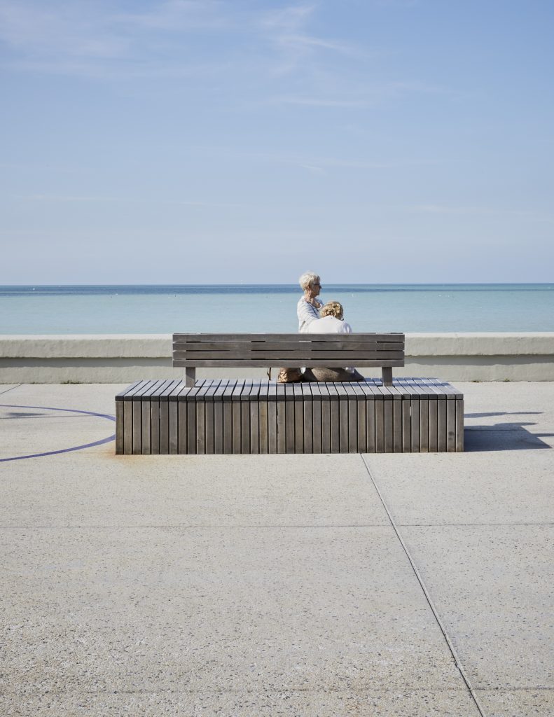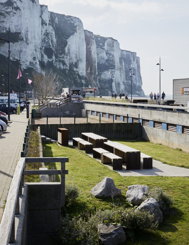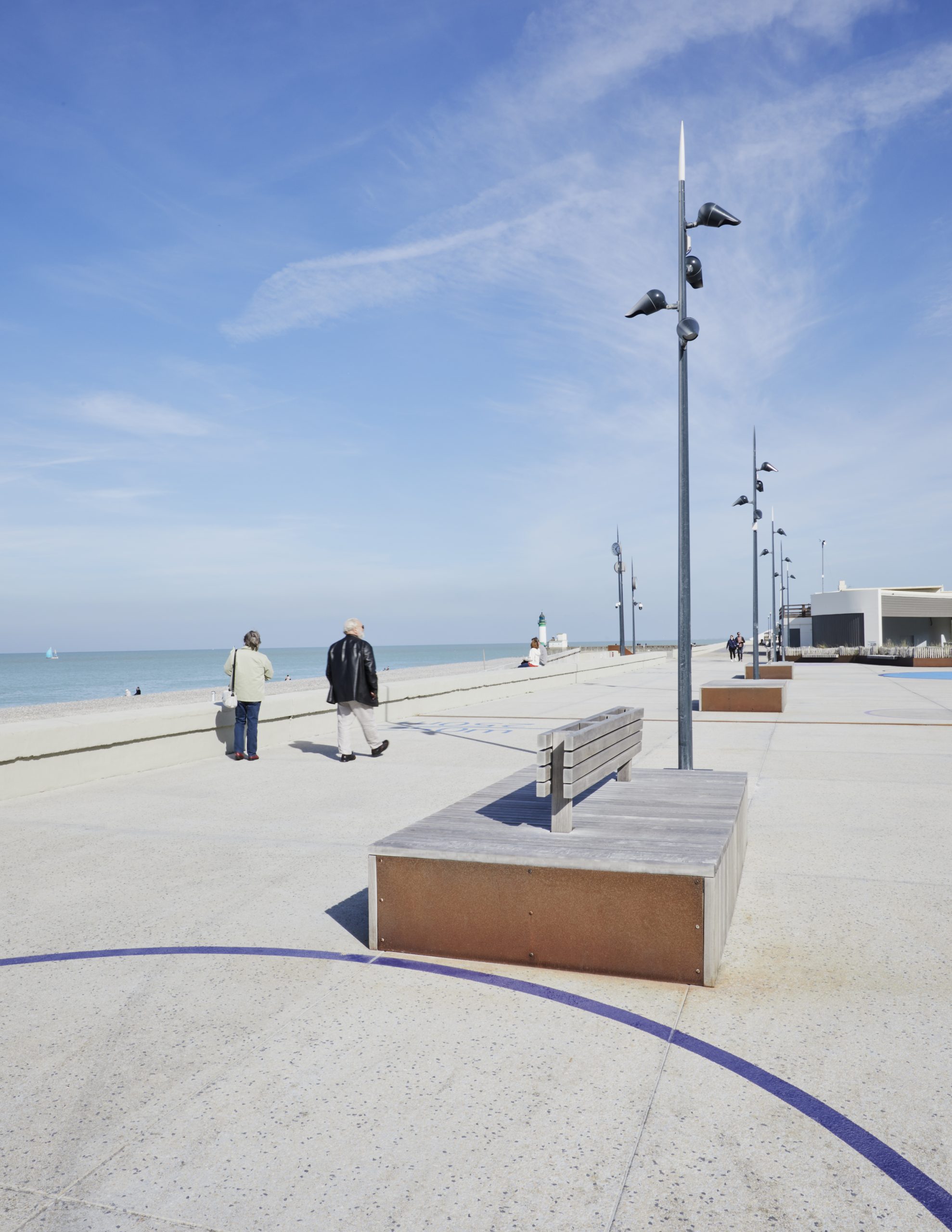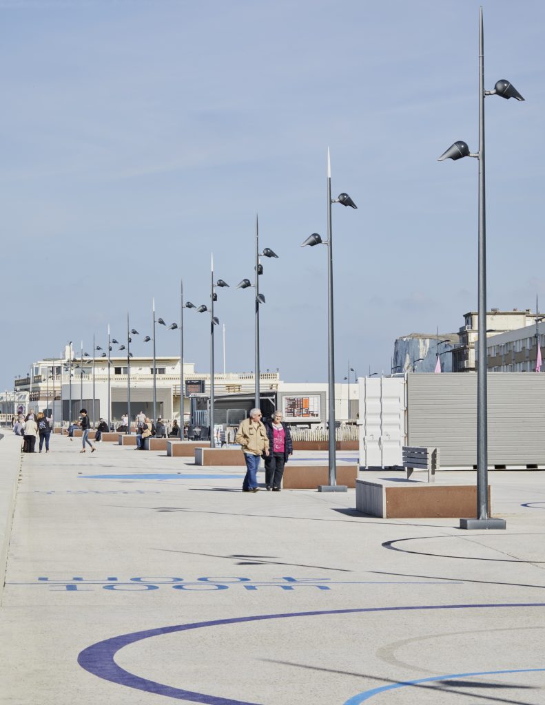Ces objectifs se traduisent par la réalisation d’un espace de promenade clairement marqué au sol, doté d’une signalisation adaptée qui régule les conflits d’usages sur la dalle haute. L’agencement et le traitement esthétique des surfaces d’exposition permettent l’installation d’un mobilier sur mesure le long de la promenade : bancs, tables de pique-nique, jardinières ou encore corbeilles de propreté, qui apportent une image contemporaine au site et renforcent la lisibilité de l’aménagement.