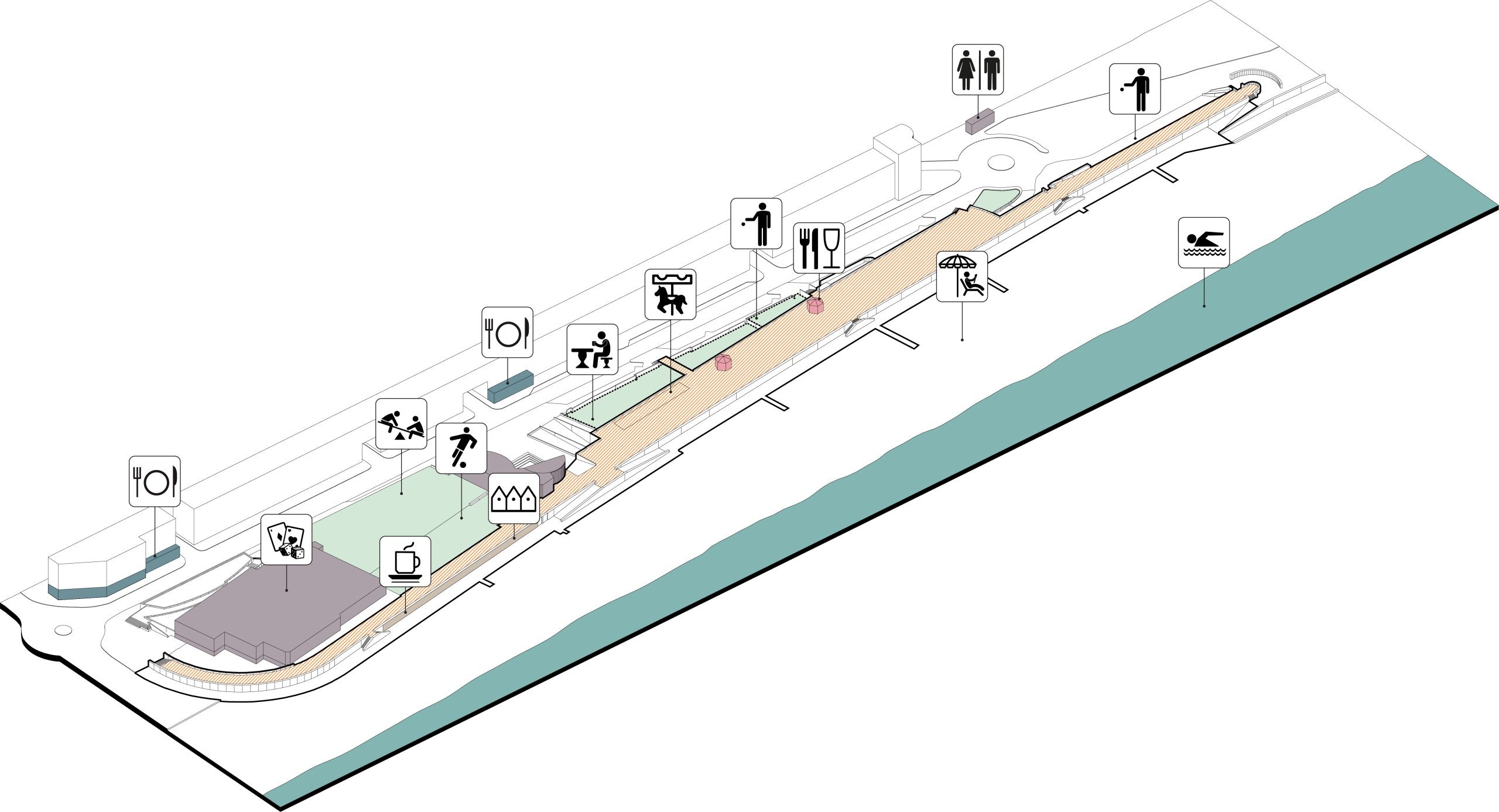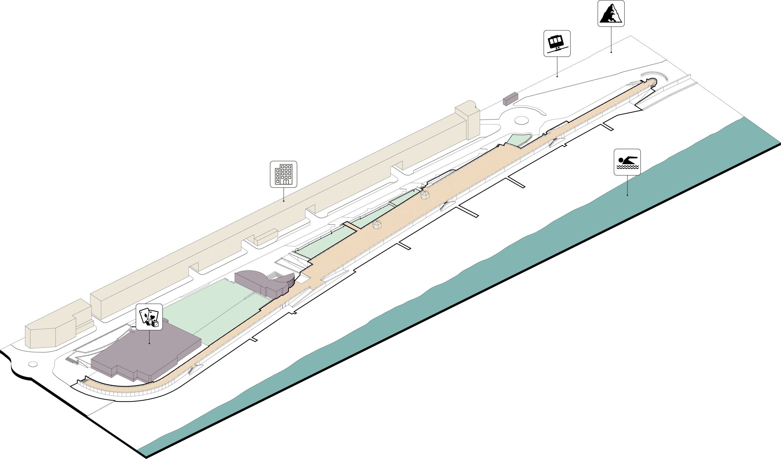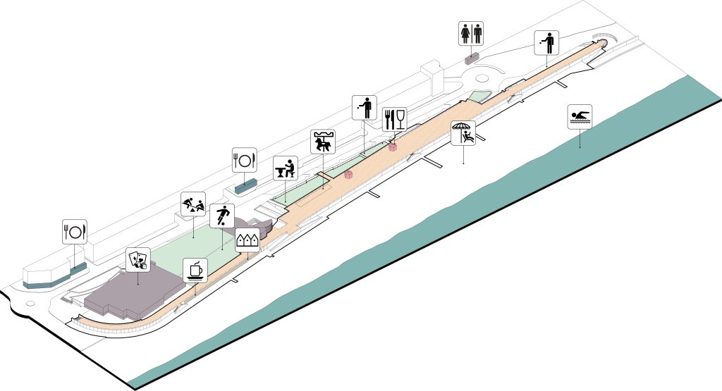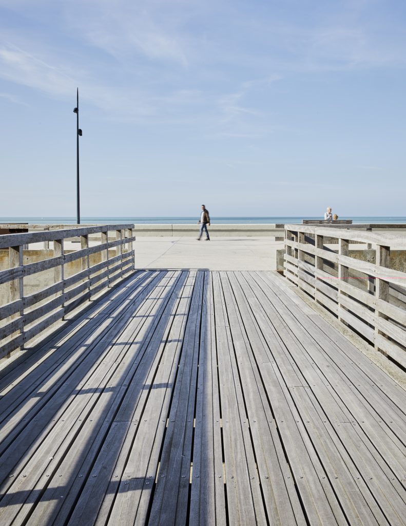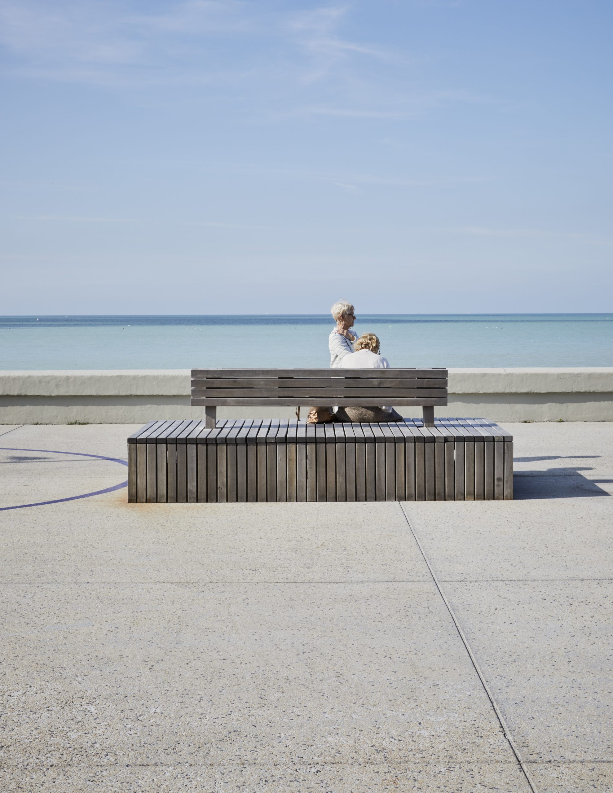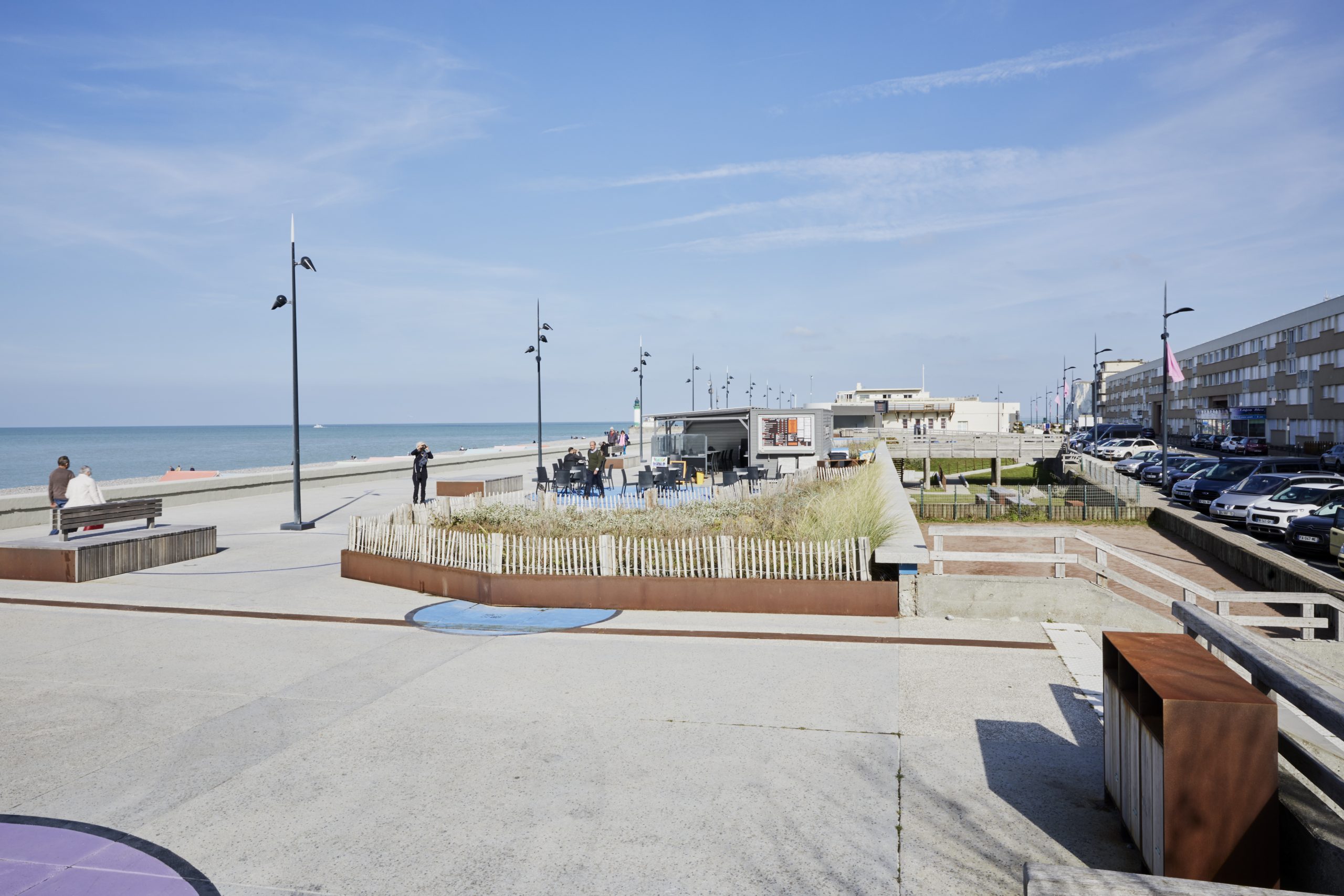 Enfin, l’esplanade haute s’enrichit d’espaces plantés évoquant l’imaginaire dunaire, créant un lien végétal entre la rue et la promenade. Cet aménagement paysager constitue la première façade perçue par le visiteur et assure une continuité visuelle sur l’ensemble du linéaire, sans obstruer les vues sur mer depuis les appartements.