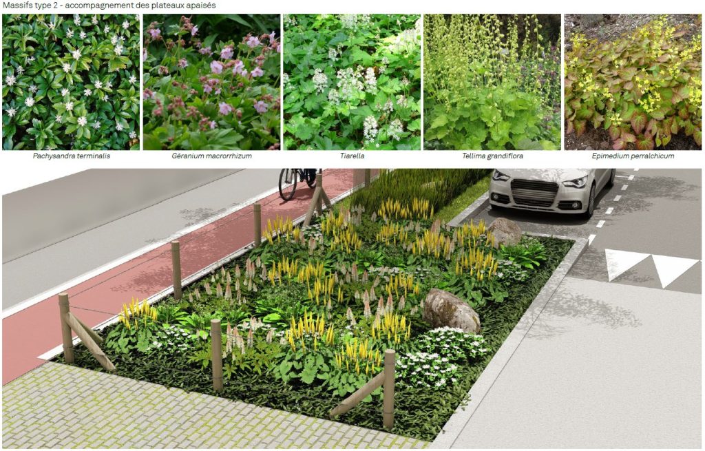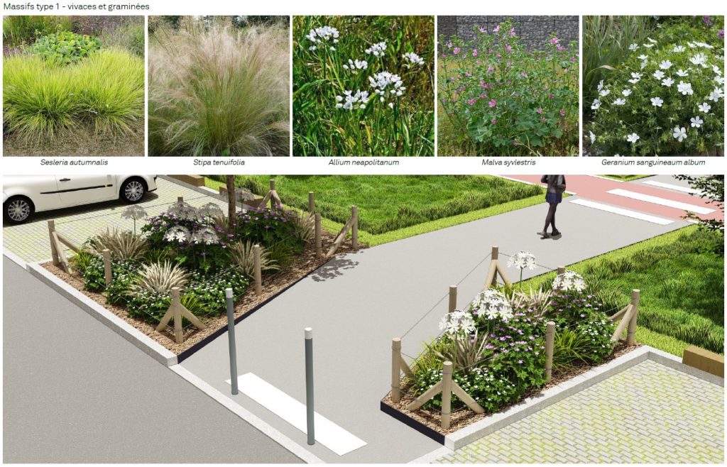 Le projet propose une approche sensible des espaces publics, où le végétal devient un élément structurant du parcours. Les massifs plantés, les pieds d’arbres requalifiés et les continuités paysagères participent à la création d’un environnement plus agréable, favorisant les mobilités douces et améliorant le cadre de vie des habitants.